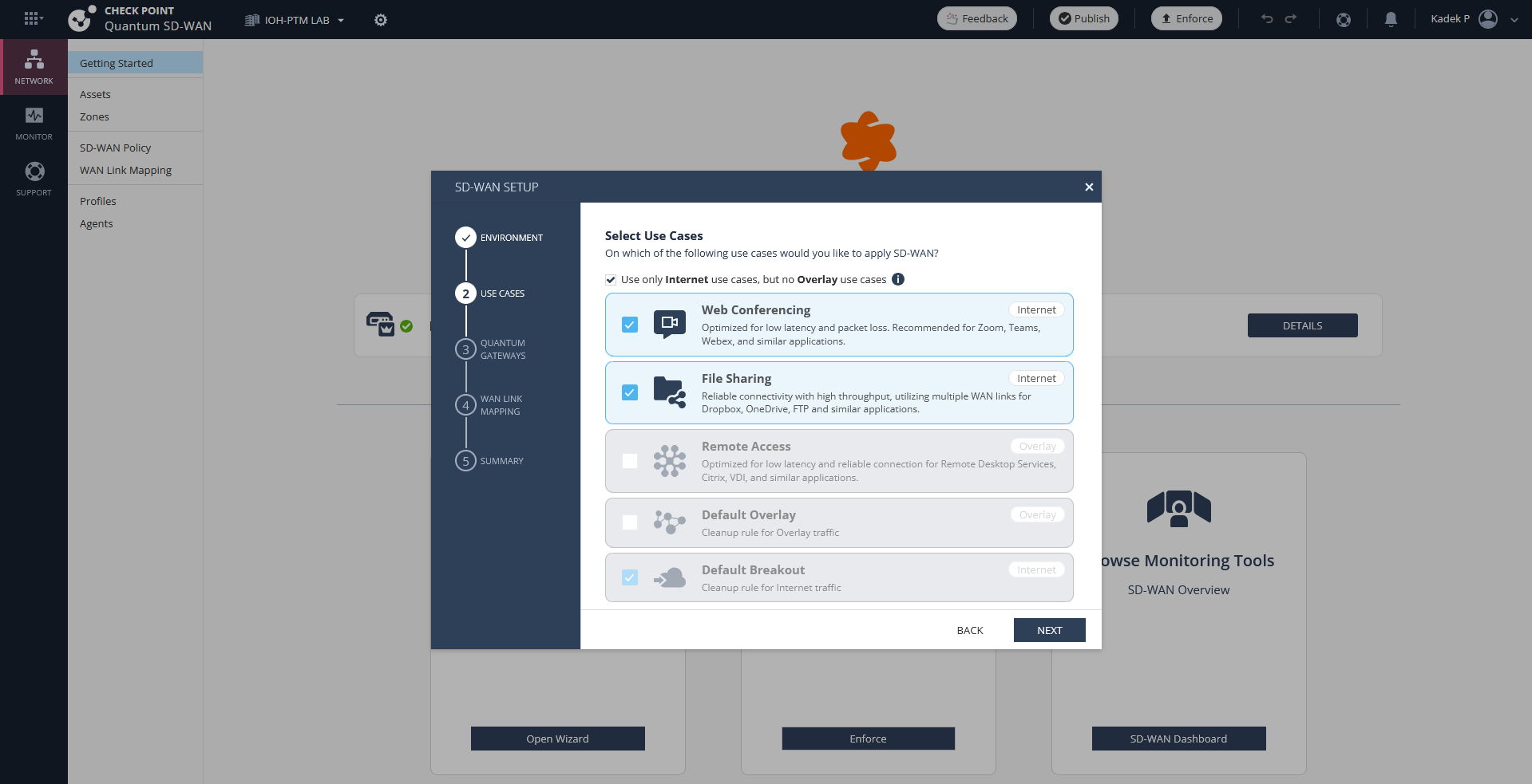 On Use Cases, this menu will generate predefined SD-WAN Policies, so lets select the default internet ones