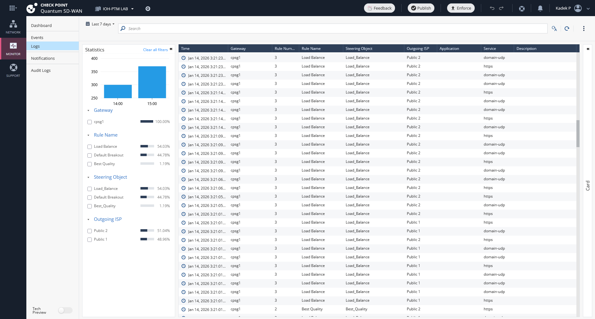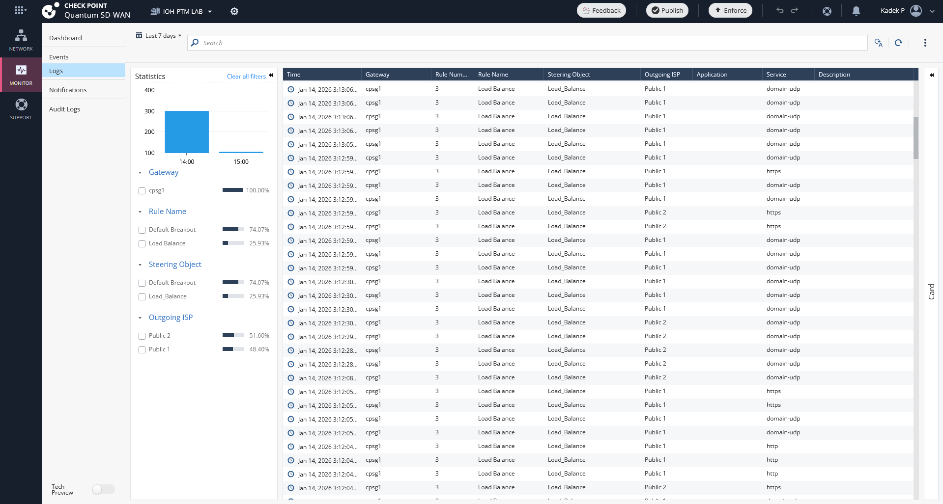 And on the logs, we can observe that it automatically steers traffic to only use the available WAN link