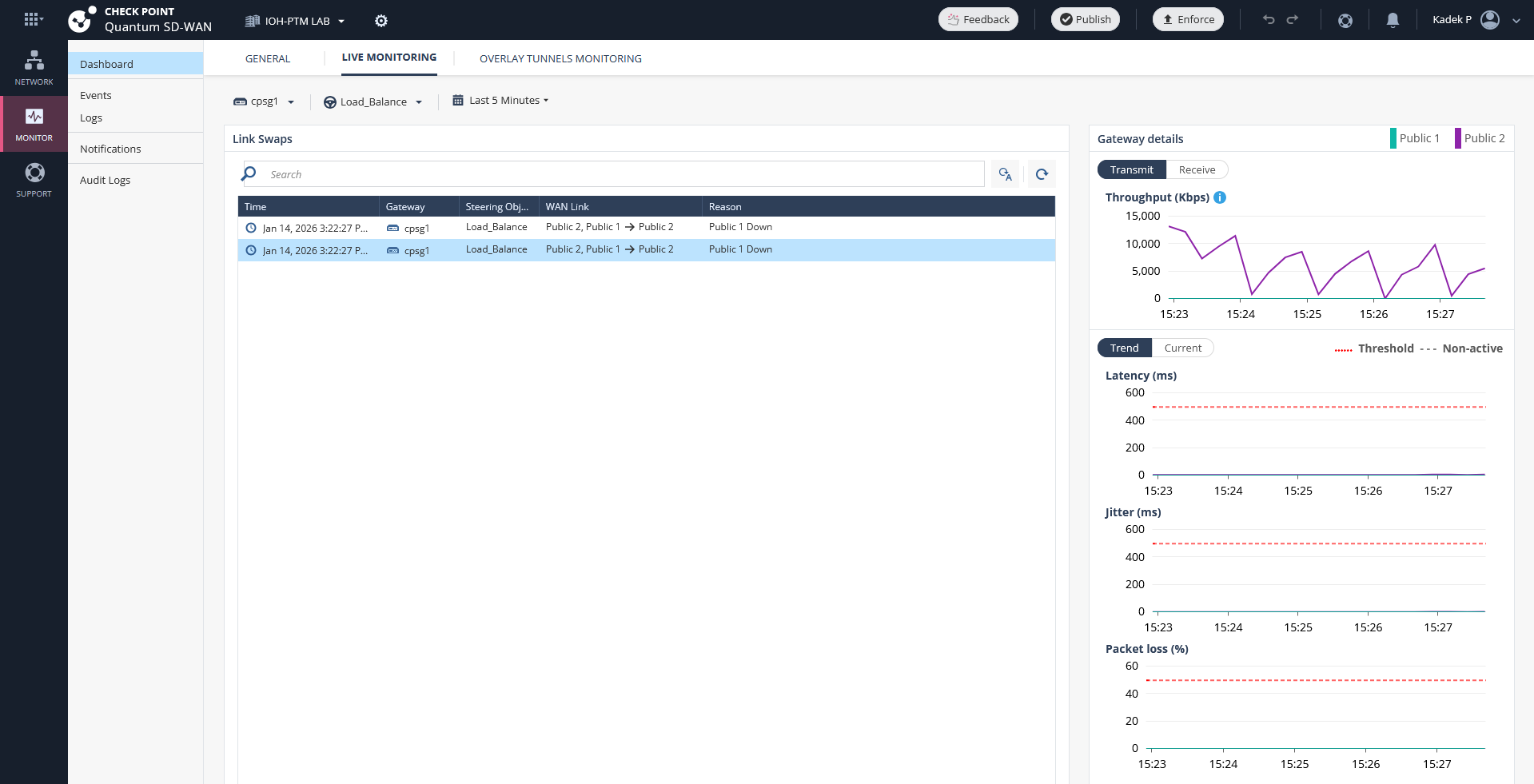 On the Dashboards we get immediate notification to see that WAN 1 is down