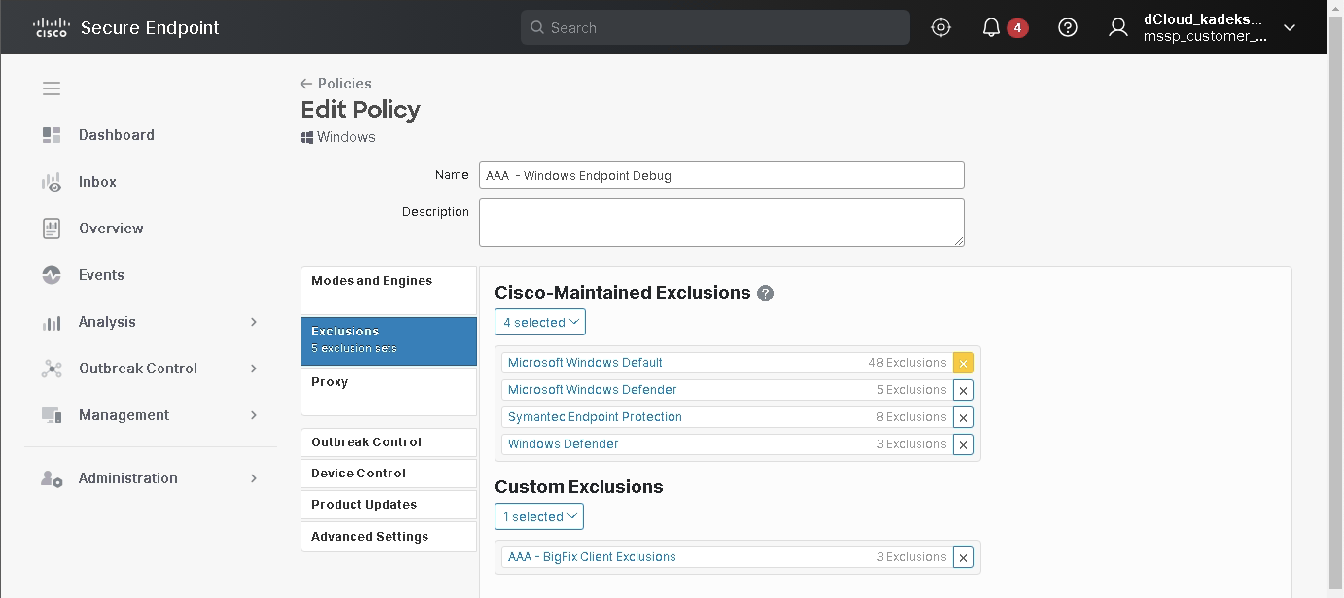 On here Select the Cisco-maintained exclusions as needed and on Custom Exclusions user the one created earlier