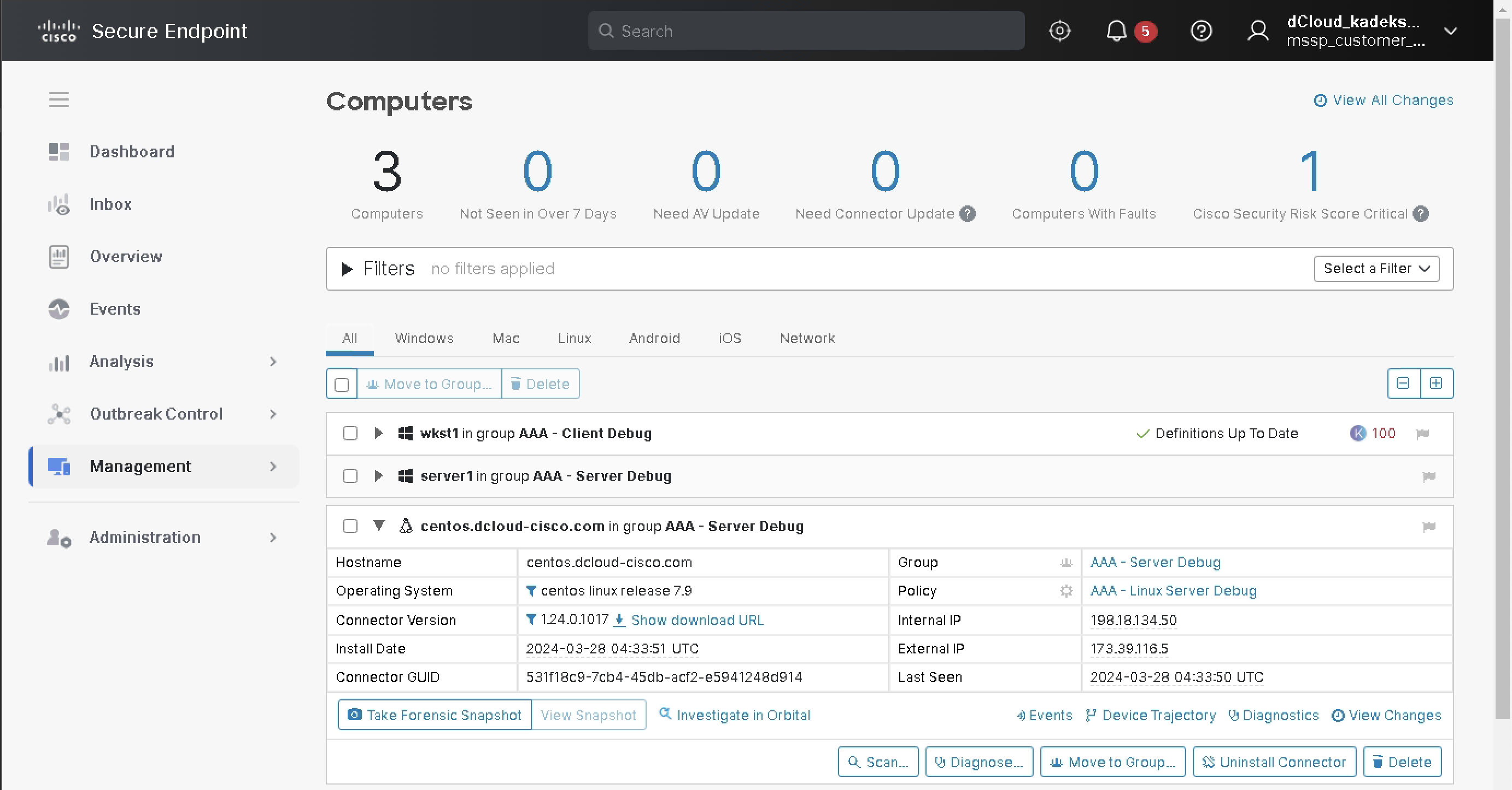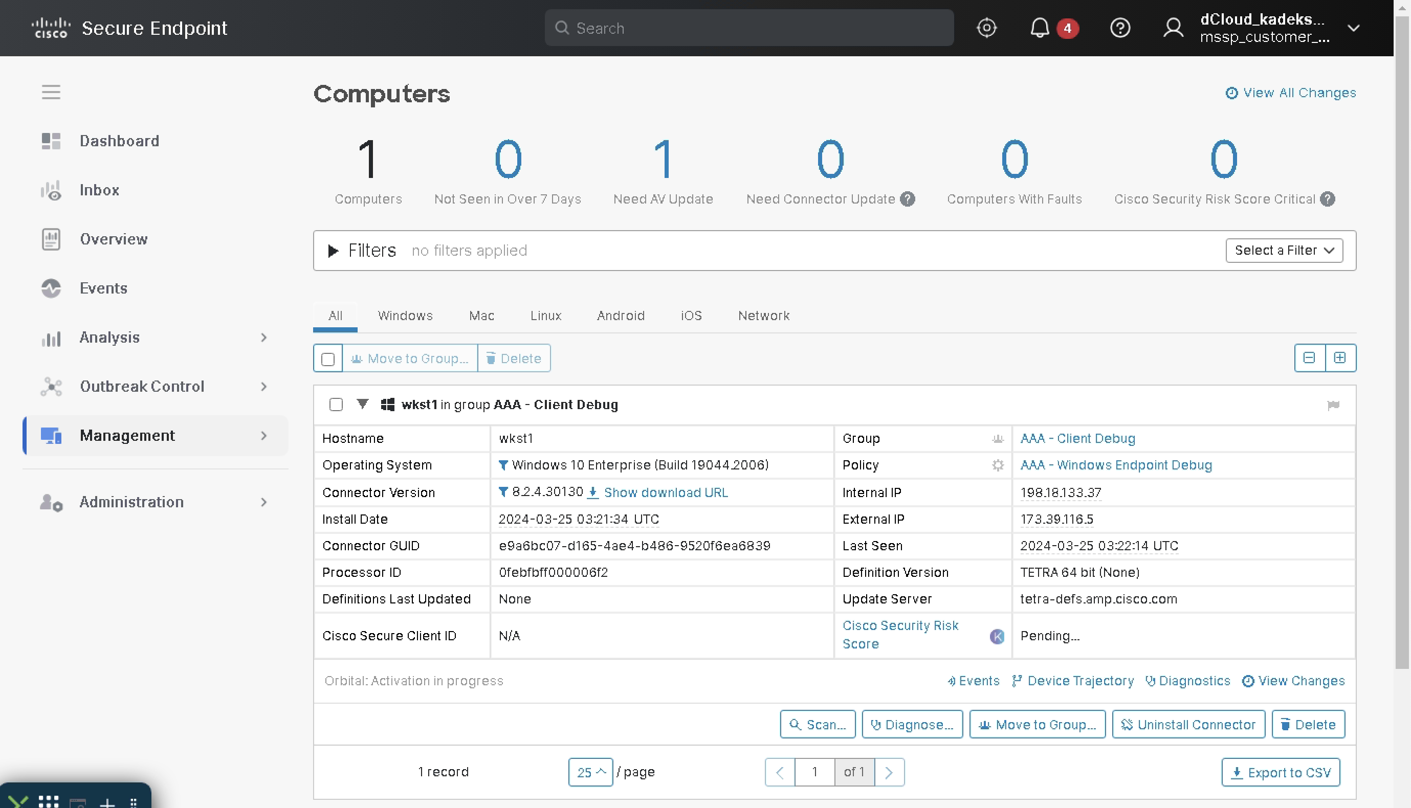 Now going back to the CSE Portal, on Management » Computers we’ll see the installed machine shows up here