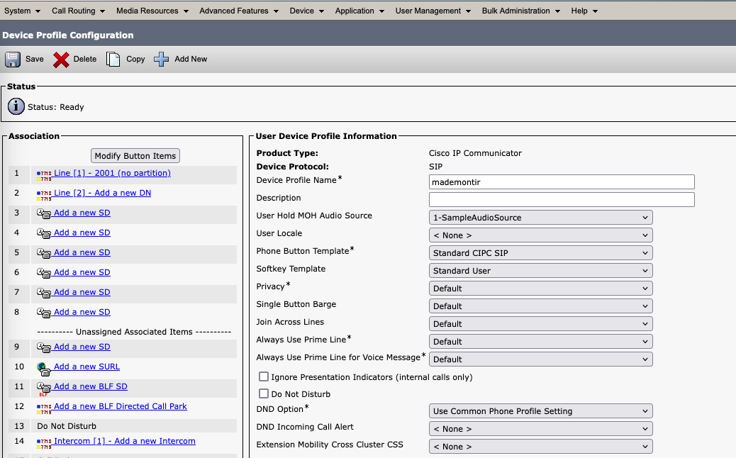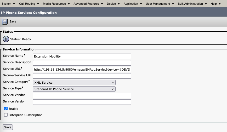 Give it a name and service URL of “http://CUCM:8080/emapp/EMAppServlet?device=#DEVICENAME#”