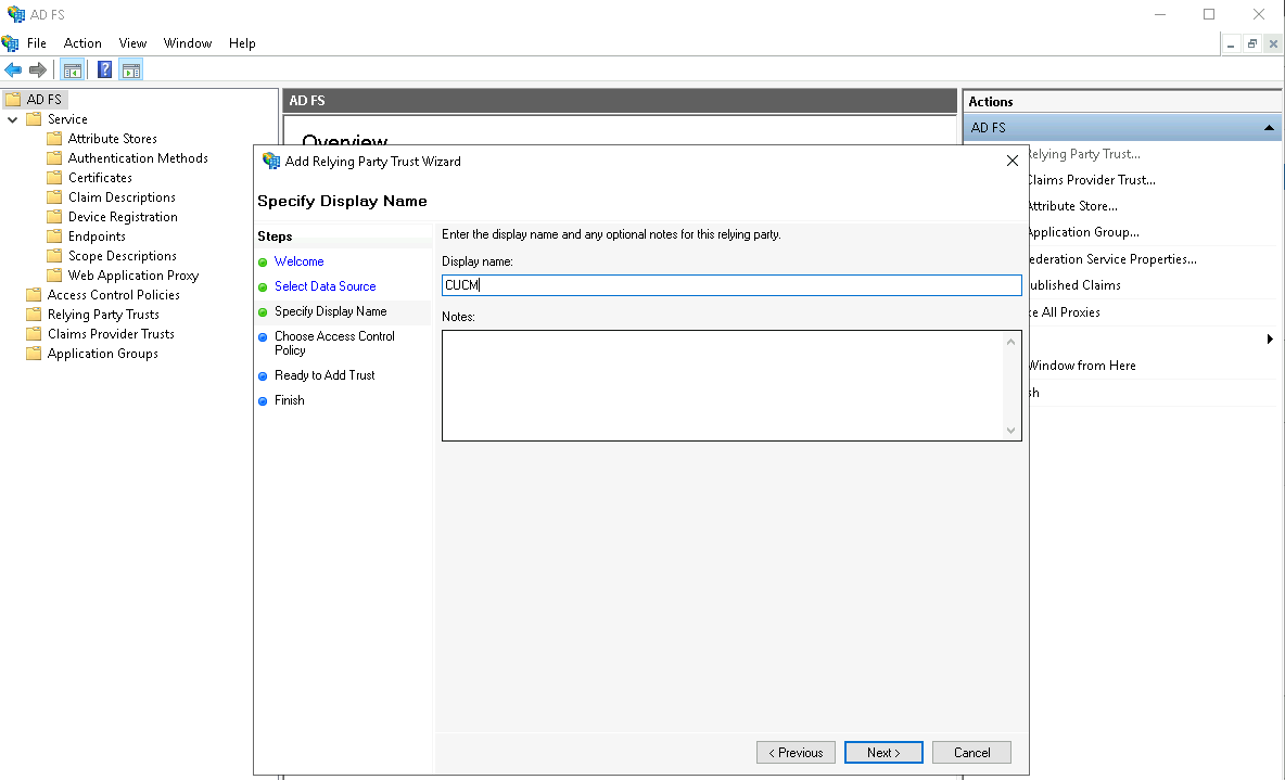 Relying party trust is a configuration that establishes a trust relationship between the ADFS server (the identity provider) and a relying party, which is the CUCM.