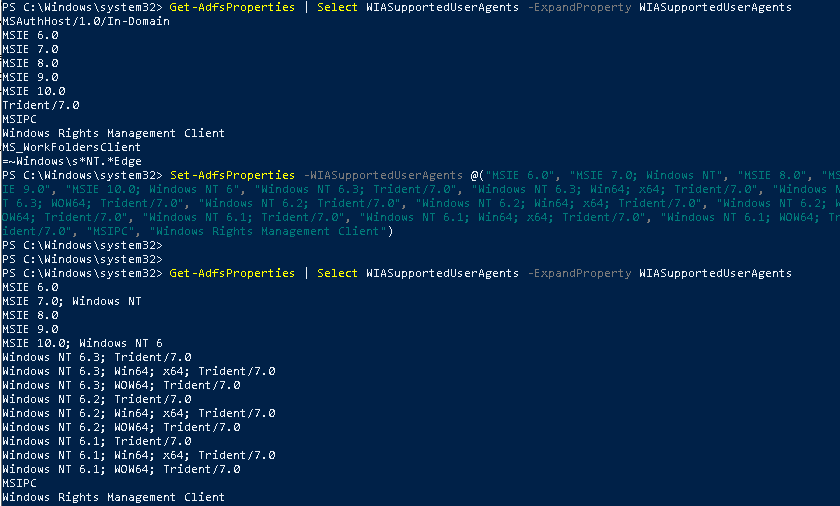 Set-AdfsProperties -WIASupportedUserAgents @(“MSIE 6.0”, “MSIE 7.0; Windows NT”, “MSIE 8.0”, “MSIE 9.0”, “MSIE 10.0; Windows NT 6”, “Windows NT 6.3; Trident/7.0”, “Windows NT 6.3; Win64; x64; Trident/7.0”, “Windows NT 6.3; WOW64; Trident/7.0”, “Windows NT 6.2; Trident/7.0”, “Windows NT 6.2; Win64; x64; Trident/7.0”, “Windows NT 6.2; WOW64; Trident/7.0”, “Windows NT 6.1; Trident/7.0”, “Windows NT 6.1; Win64; x64; Trident/7.0”, “Windows NT 6.1; WOW64; Trident/7.0”, “MSIPC”, “Windows Rights Management Client”)