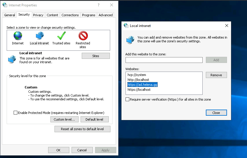 Now on the client side, we also need to whitelist the ADFS Server on the Internet Properties of every client trying to authenticate