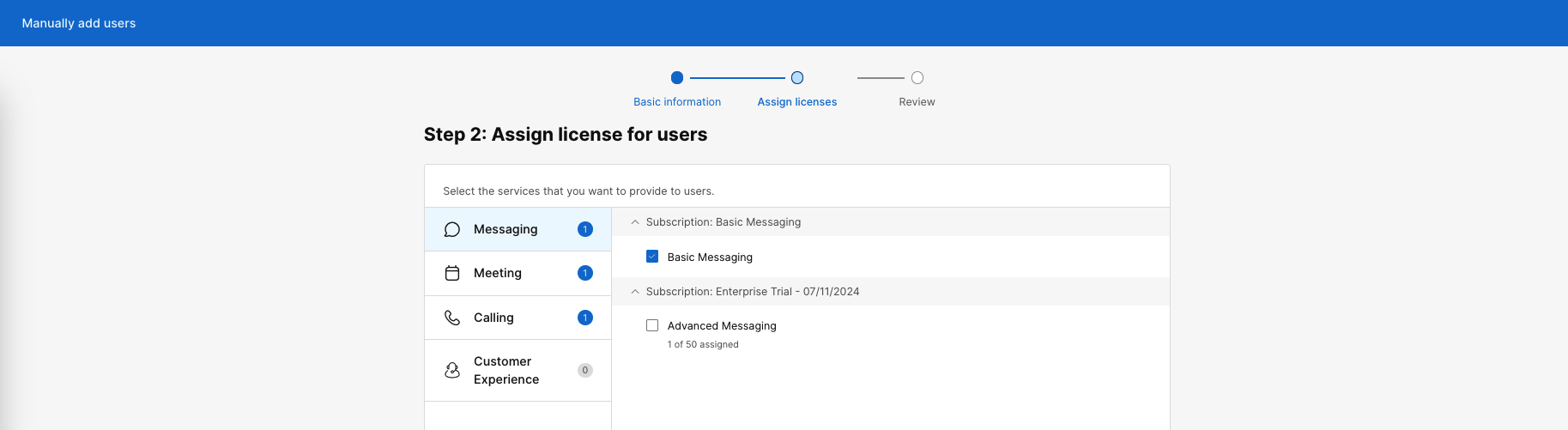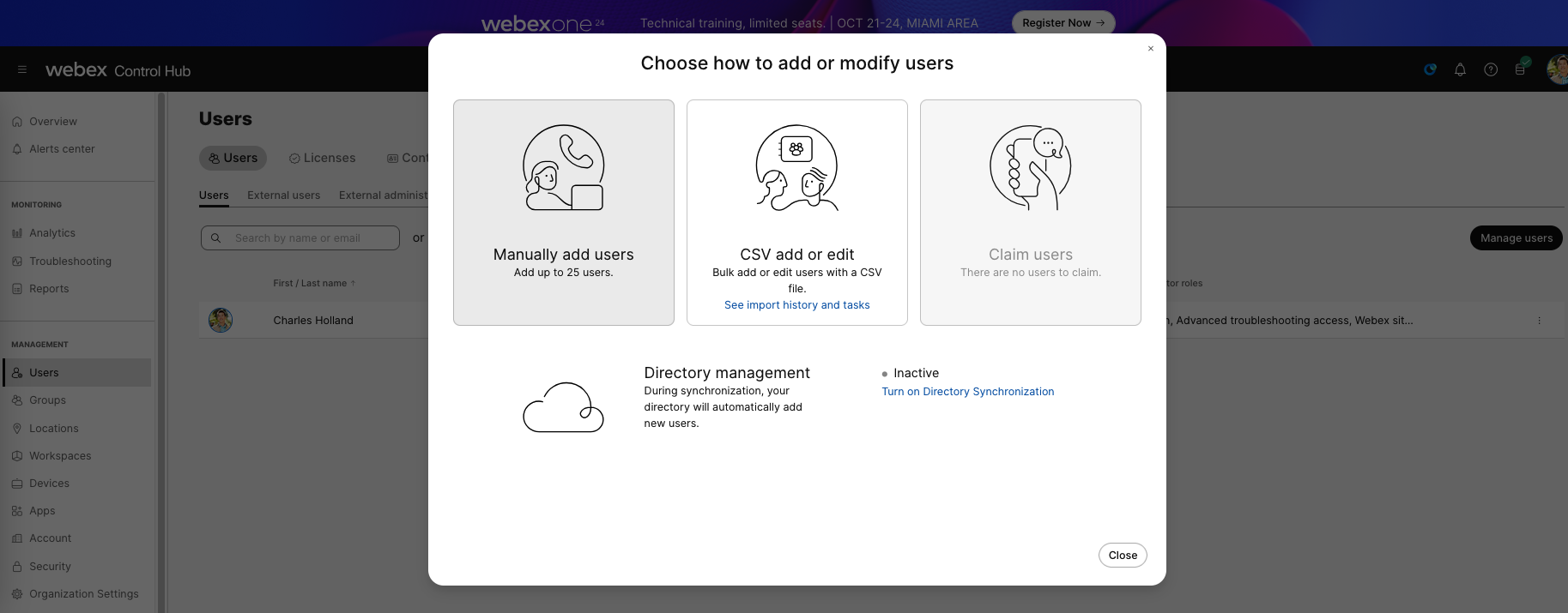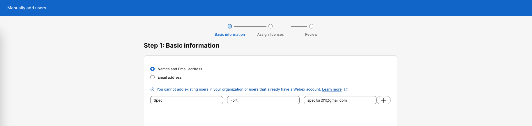 On Webex Control Hub, go to Users » Manage Users » Manually Add Users