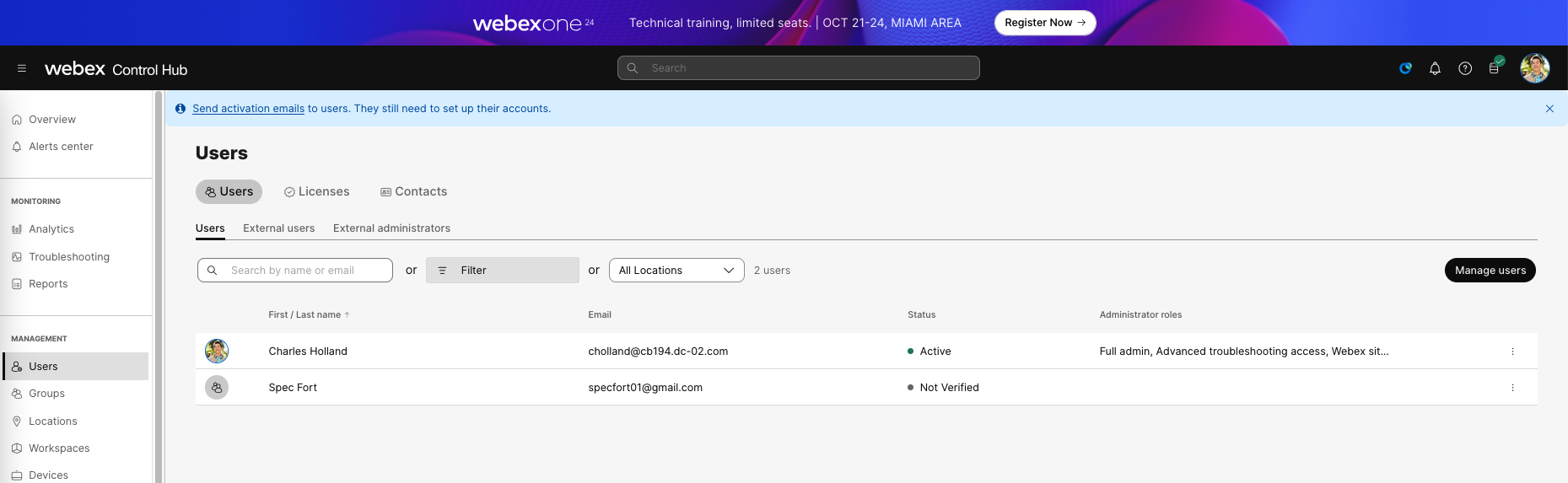 And now the Users are listed on Control Hub with status of Not Verified, select Send Activation Emails to send email activation to these users