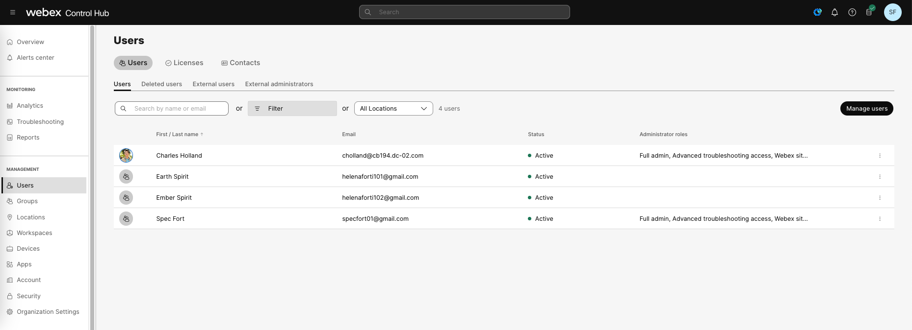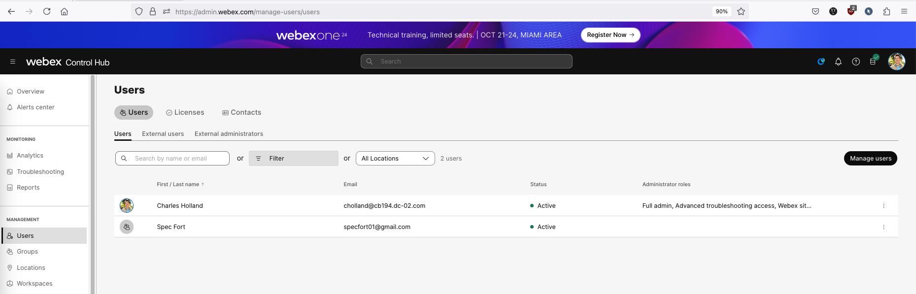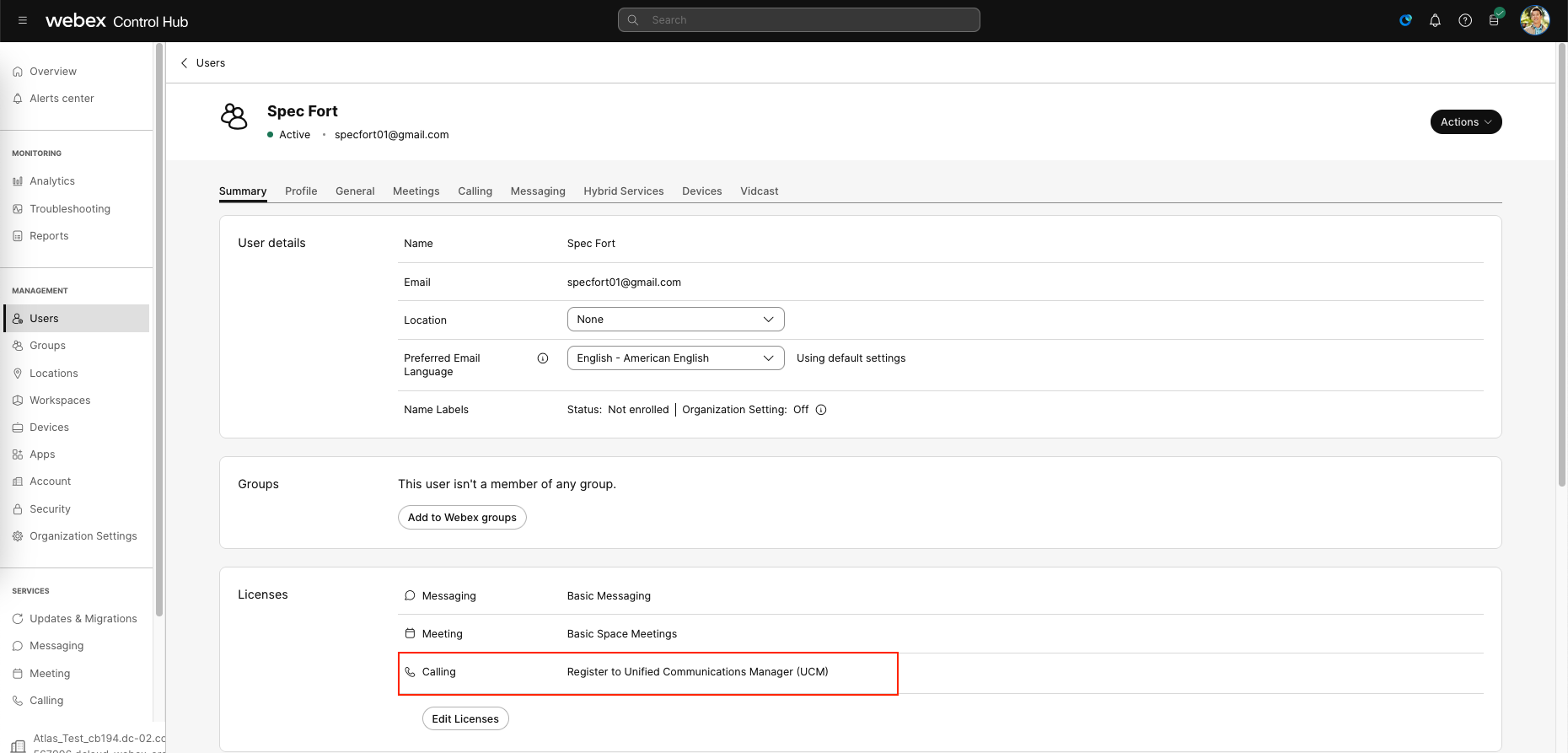 Now the user is shown as active on Control Hub