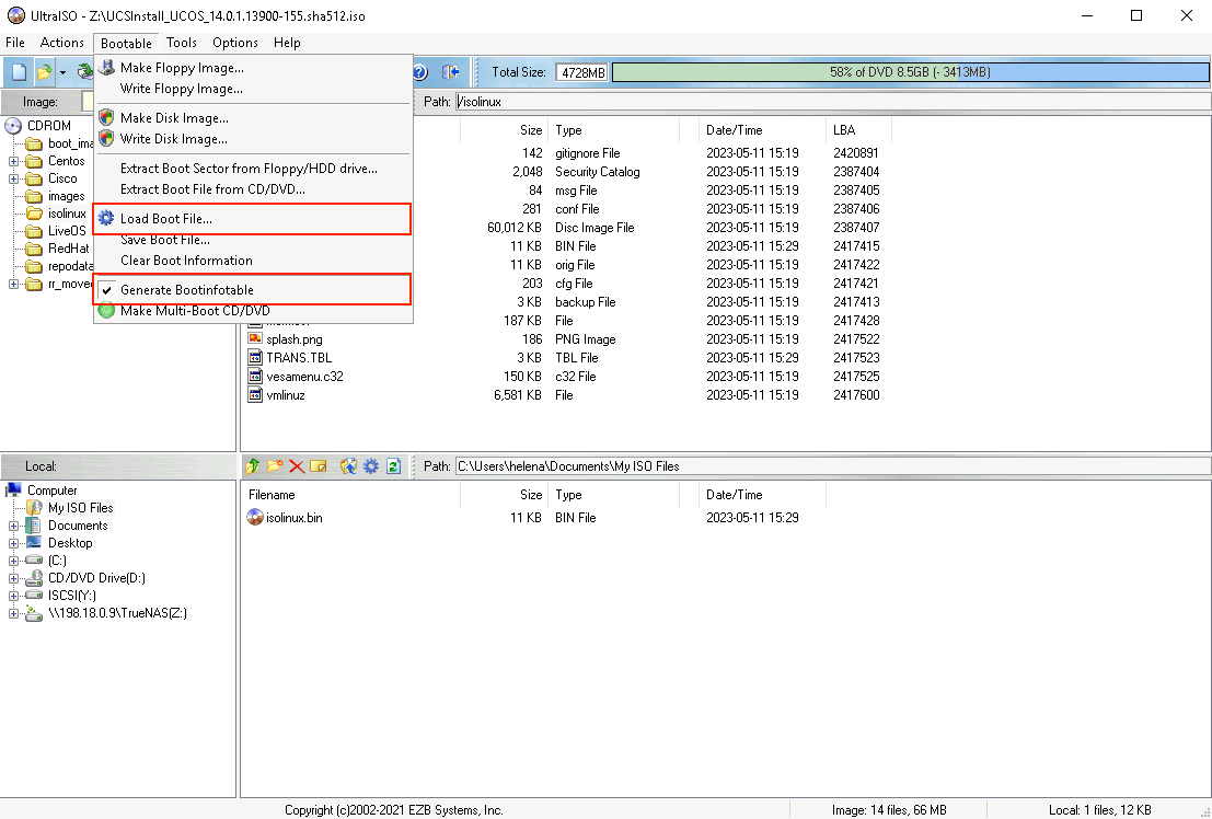 After that, on Bootable menu, check the “Generate Bootinfotable” and select “Load Boot File”
