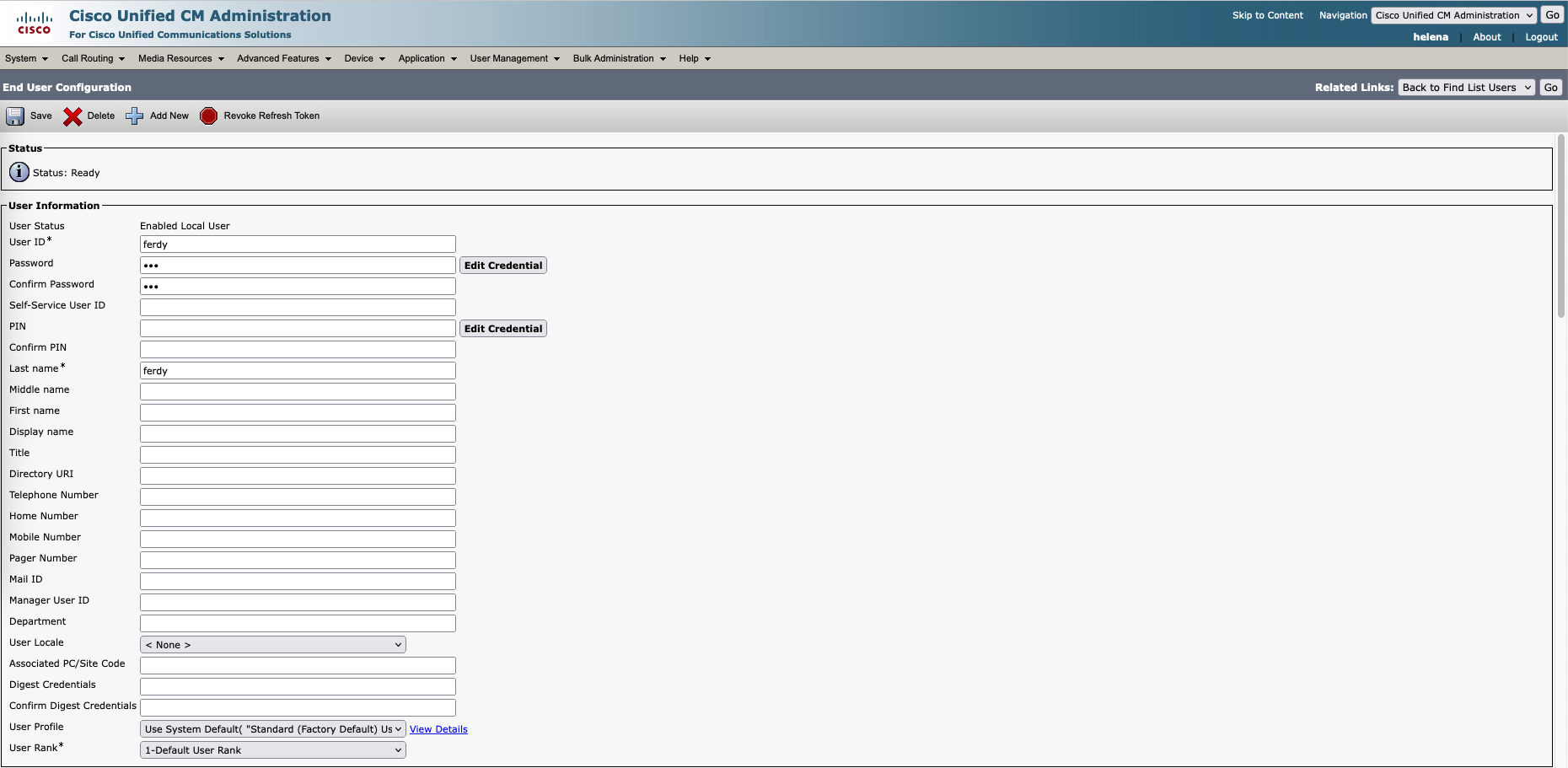 Next on Unified CM Administration, create an End User used to login on User Management » End User