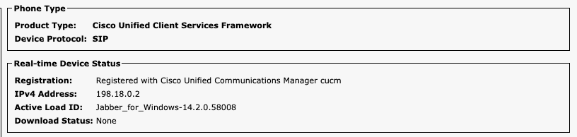 Checking on CUCM also shows that device is registered on PC with IP 198.18.0.2