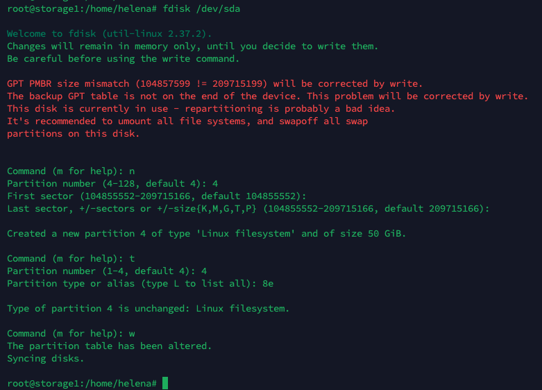 The hex code ‘8e’ is the code for a Linux LVM which is what we want this partition to be, as we will be joining it with the original /dev/sda4 Linux LVM