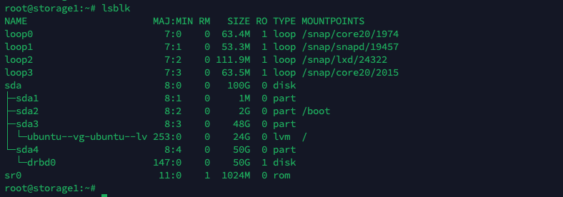 Now if we run “lsblk”, we can see the drbd0 device created