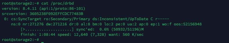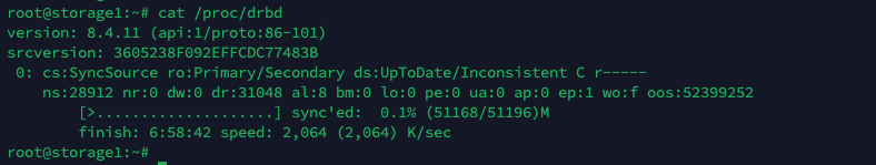 Running “cat /proc/drbd” shows that this node has become the primary. We can also see the syncing process