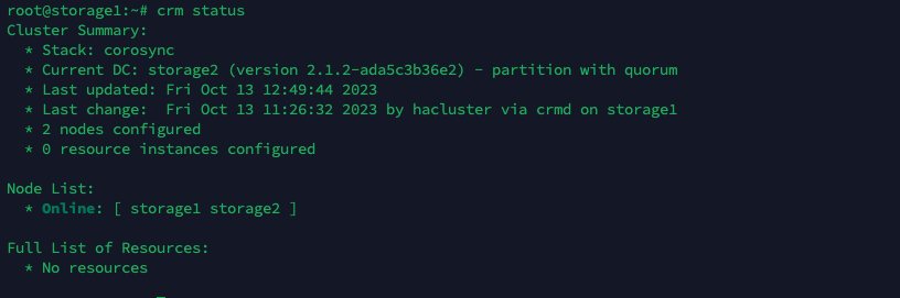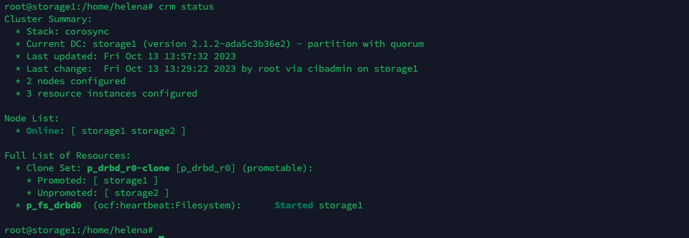 This cluster summary provides an overview of a Pacemaker cluster with two nodes (“storage1” and “storage2”). It is currently operational with quorum and manages several resources, including a promotable DRBD clone set and a filesystem resource. The current designated controller is “storage1” with a summary showing that the cluster is in a healthy and operational state.