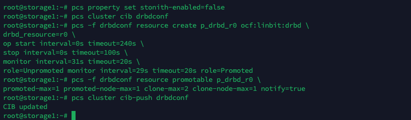 Next create a Pacemaker resource named “p_drbd_r0” to manage a DRBD resource “r0.” This sets parameters for starting, stopping, and monitoring the resource, including timeout values for various operations.