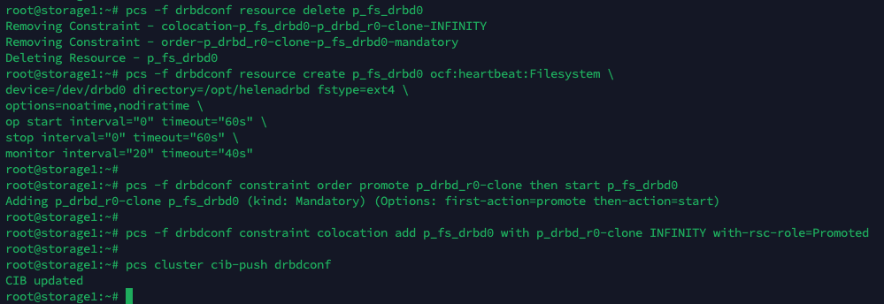 Next, create a Pacemaker resource named “p_fs_drbd0” to manage a filesystem on a DRBD device (/dev/drbd0). The filesystem is mounted at the “/opt/helenadrbd” directory, using the ext4 filesystem type with specific options. It sets parameters for starting, stopping, and monitoring the resource.