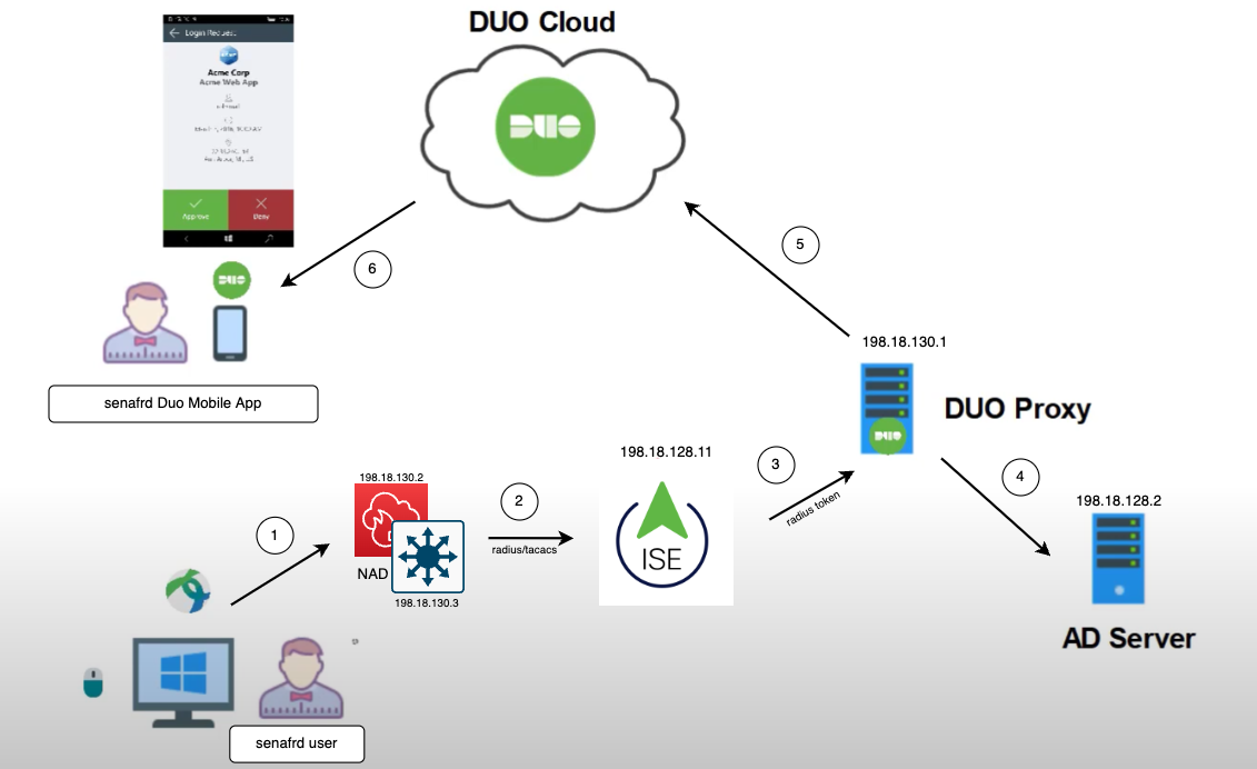 Cisco Duo integrates with Cisco ISE to enable Multi-Factor Authentication (MFA) for network access. The integration involves configuring Cisco ISE as a RADIUS client for Duo’s Authentication Proxy, which acts as an intermediary between ISE and Duo’s cloud service. When a user attempts to authenticate, ISE forwards the authentication request to the Duo Authentication Proxy, which validates the primary credentials to Active Directory. If successful, Duo triggers a second-factor authentication to the user. Upon successful MFA, ISE grants network access based on the configured policies.