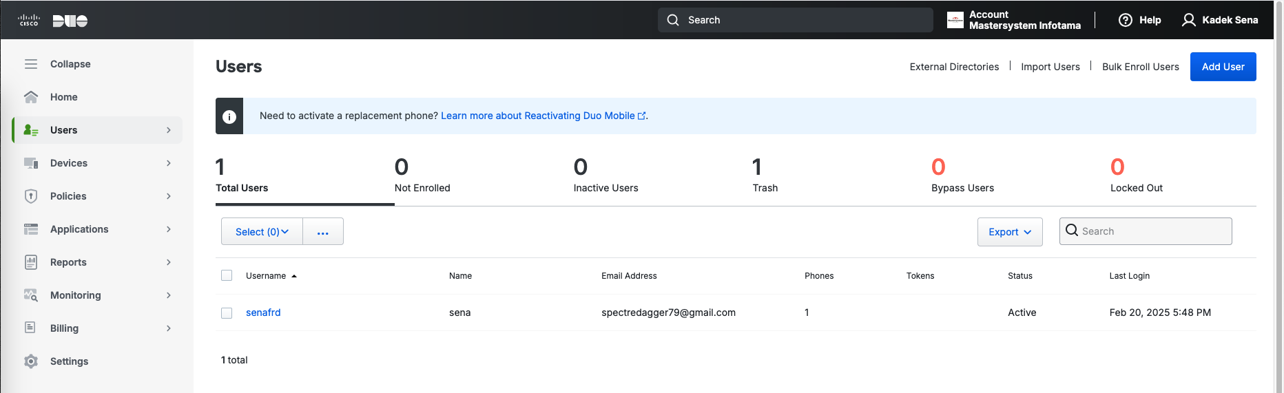 Everything configured here is continuing from this Cisco Duo and ASA AnyConnect Integration post, here on the Cisco Duo Admin Portal we make sure that the user is present