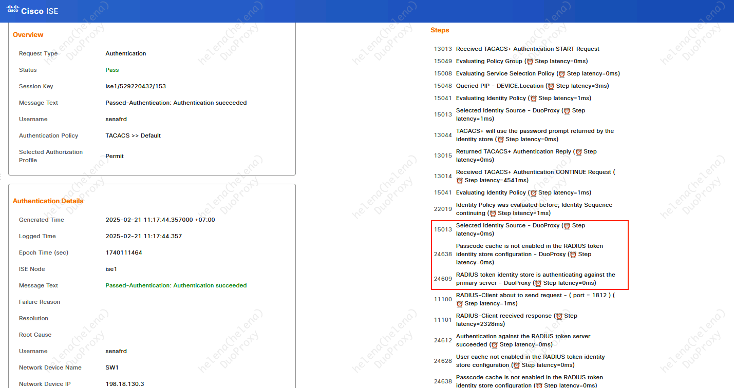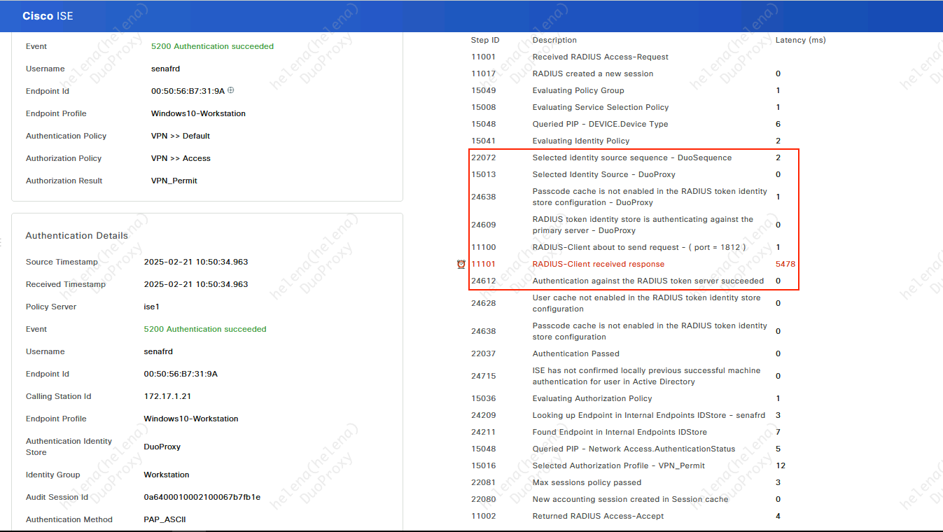 On the Radius Live Logs Details, we can see that the ISE uses the Duo Proxy as the Identity Source for Authentication