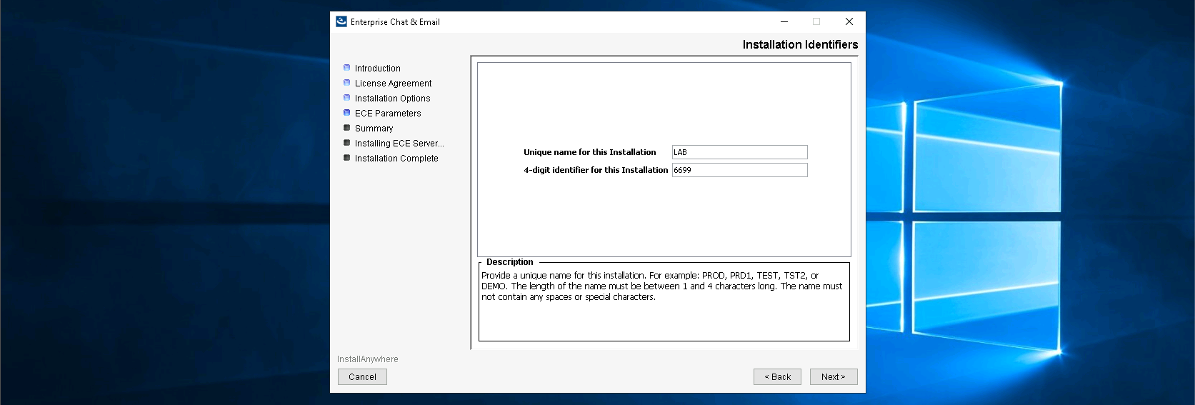 Next set the installation name and a unique 4 digits identifier value