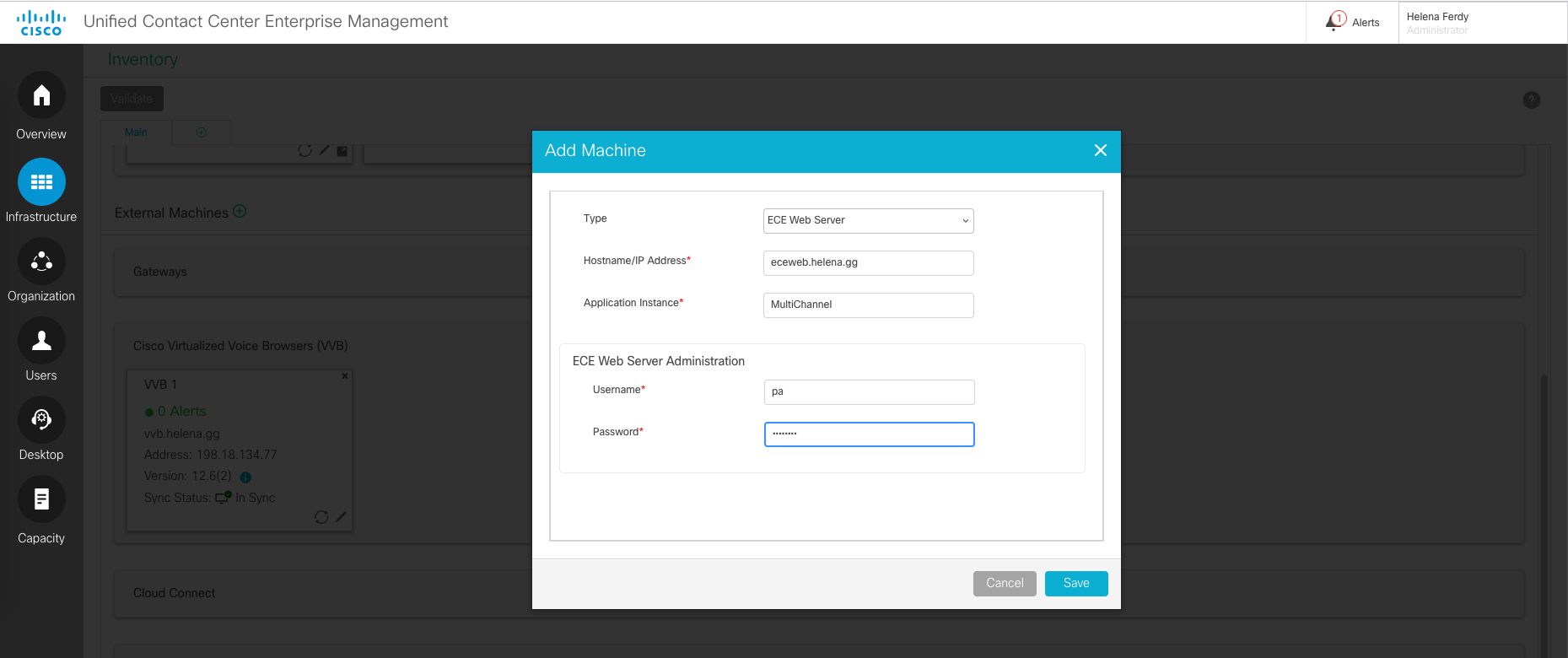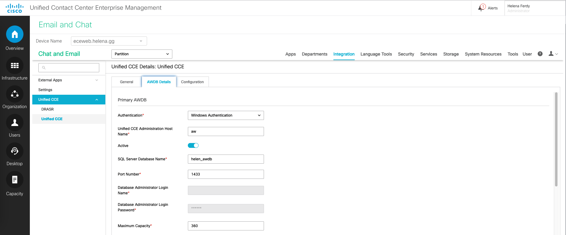 Access it, and go to Integration » Unified CCE, fill in the AW details