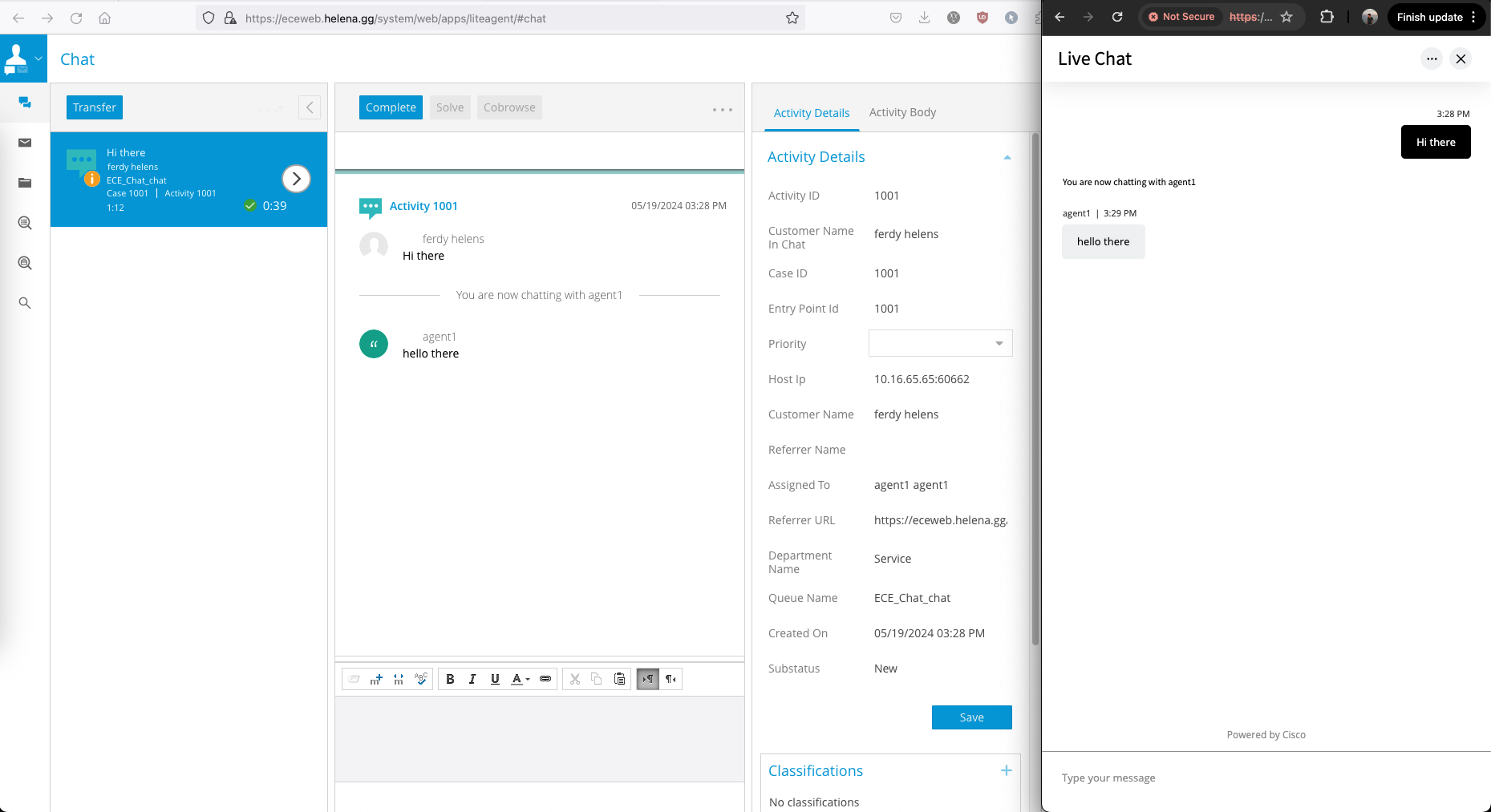 And now if we login as an agent and hit the Entry Point as the customer, we have a livechats!