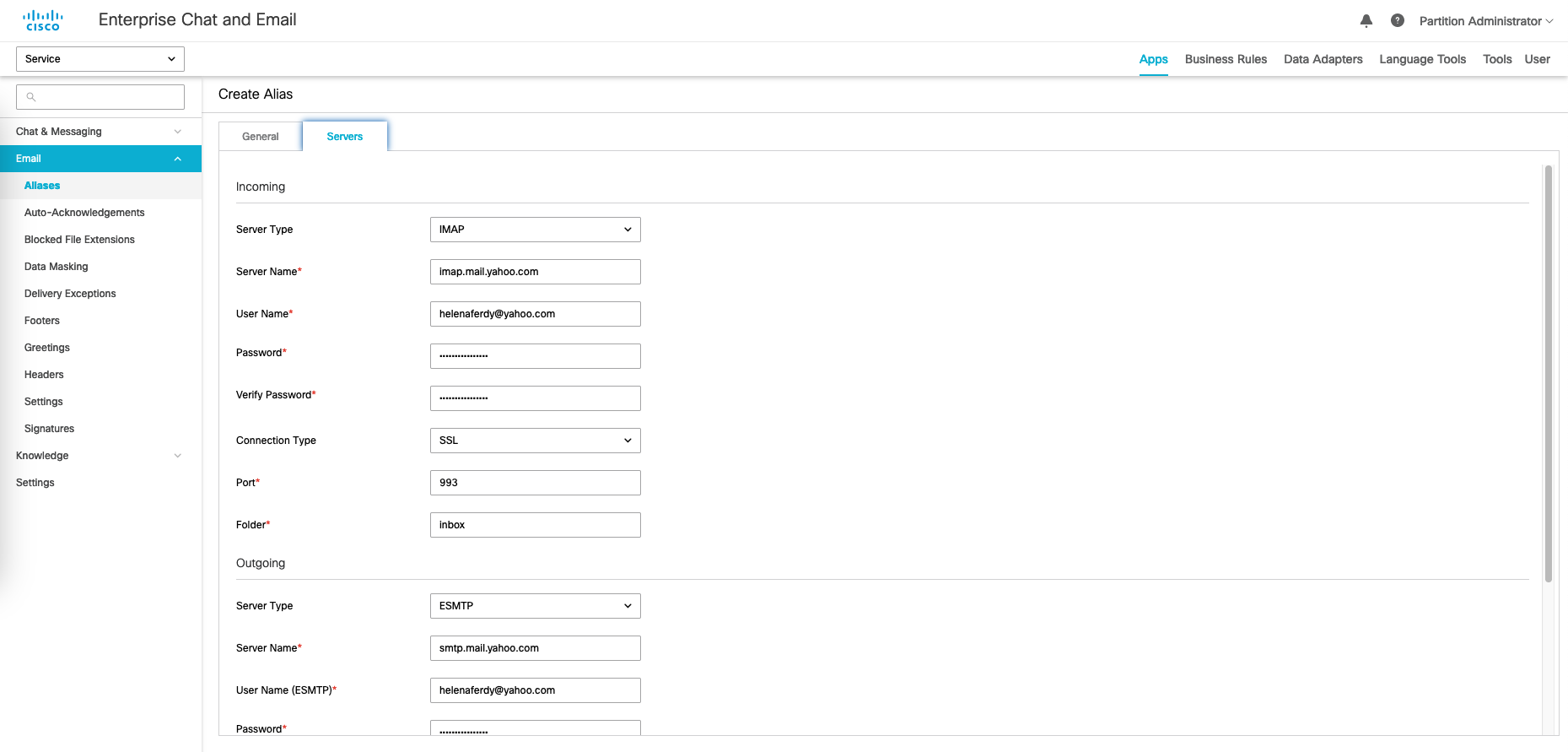 To configure email, add a new alias containing the email details