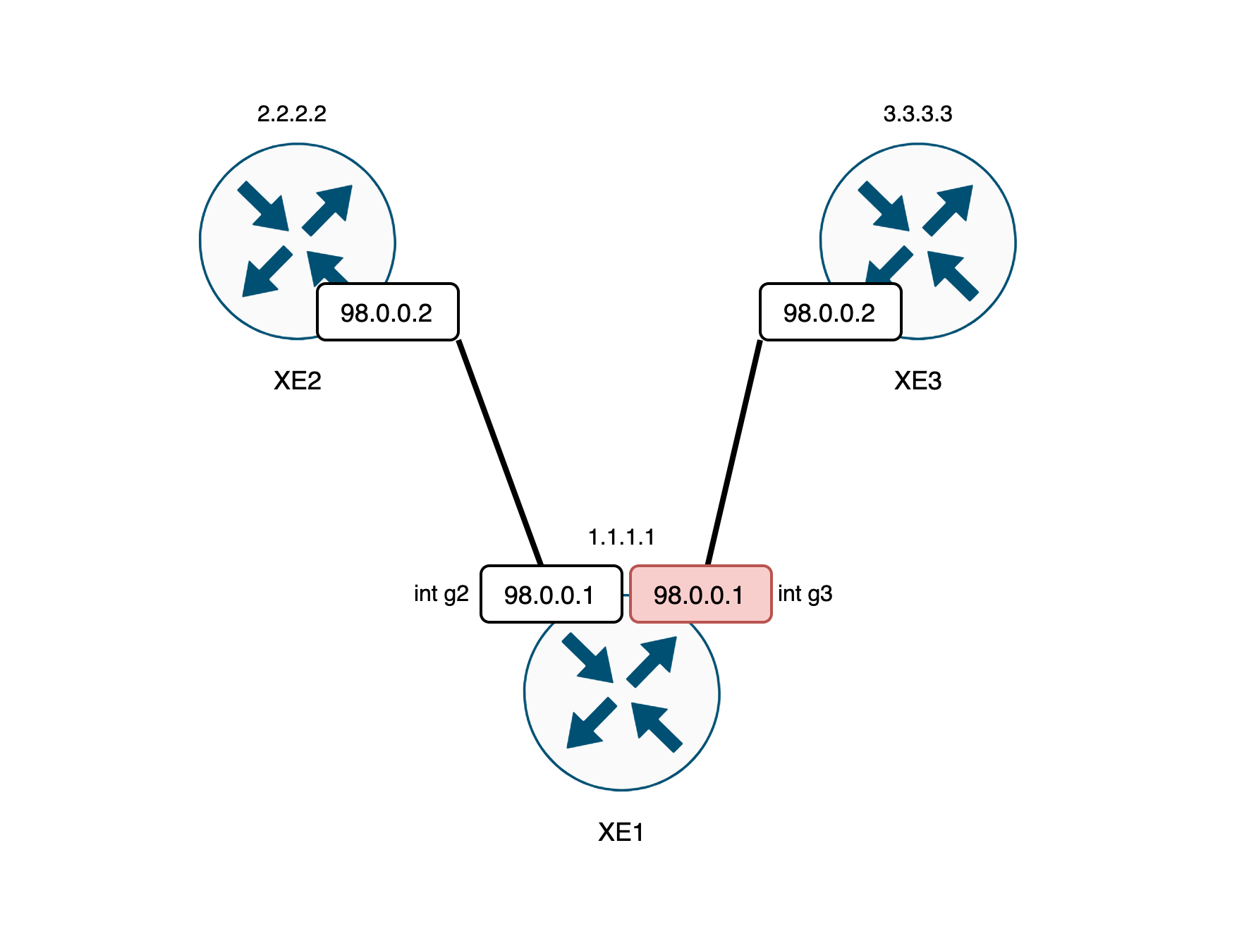 The XE1 has a default uplink going to XE2, here we’ll use EEM to detect and automate a task where when the link to XE2 is down, we’ll swing the uplink to XE3.