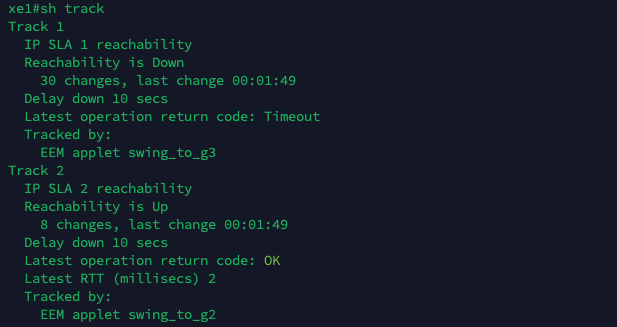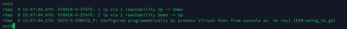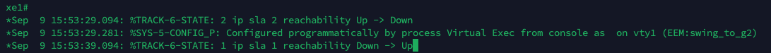 Now when we shutdown the XE2, we can see the the EEM syslog stating that track 1 is down and track 2 becomes up, and we can also see the EEM:swing_to_g3 script is being executed.