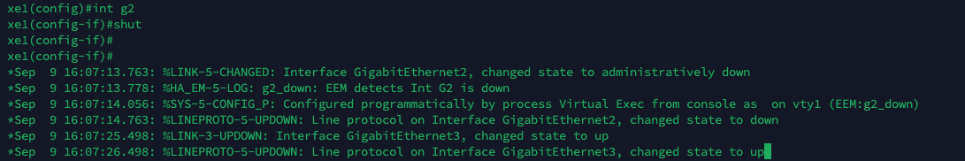 Lastly, if we now shutdown XE3 (while the XE2 is already up), we’ll see EEM:swing_to_g2 script is executed swinging the interface back to g2