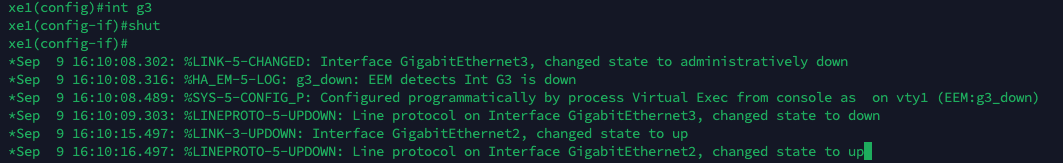 Now when we shutdown the int g2, we can see the EEM:g2_down is executed bringing int g3 up