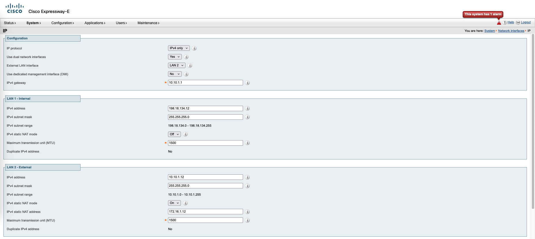 Because Exp-E uses two interfaces, go to System » Network interfaces and configure the Internal and External interfaces