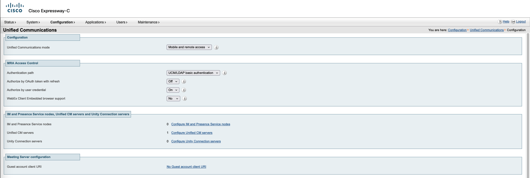 On Core, go to Configuration » Unified Communications, select the mode to be MRA and configure the authentication method