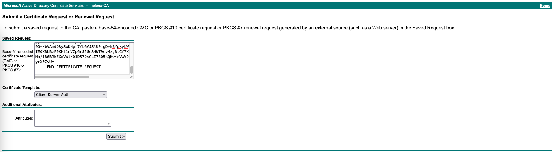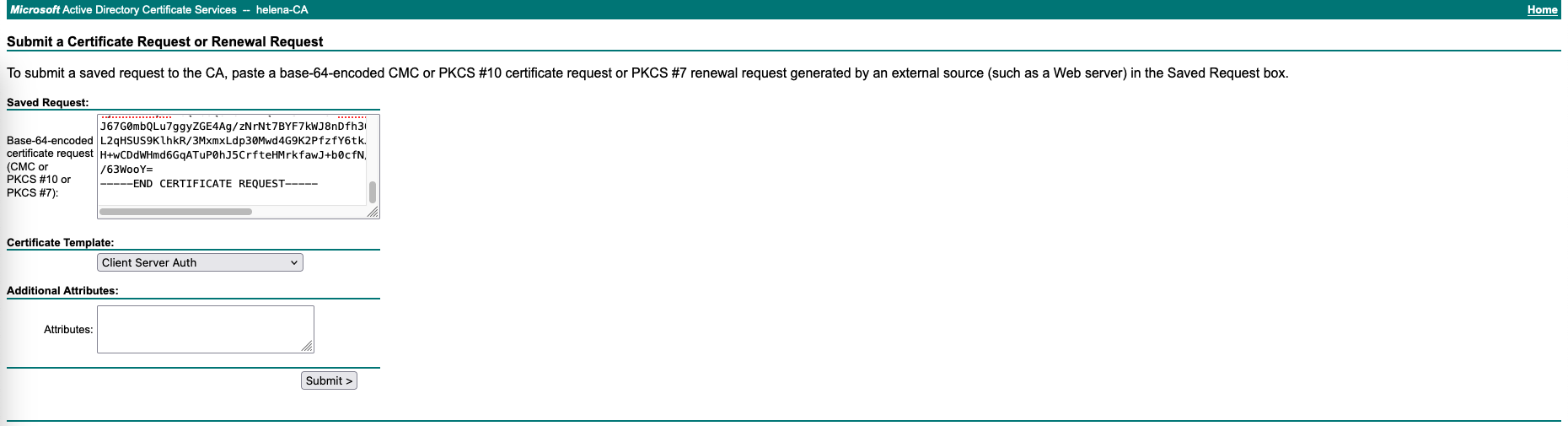 Then sign the CSR on the Certificate Authority using Client Server Auth Template