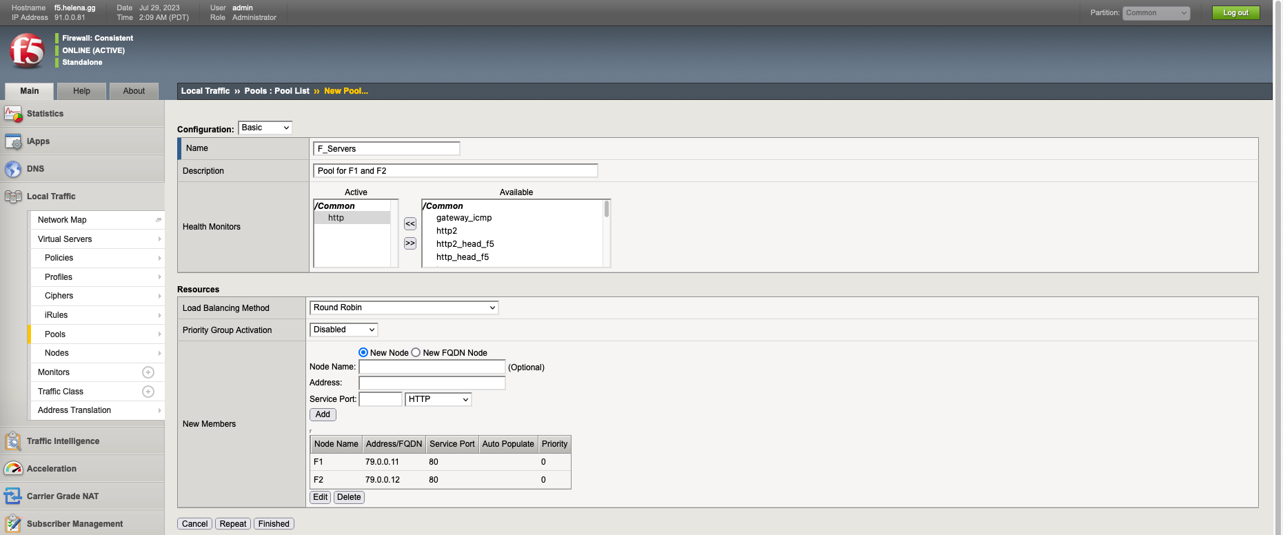 Here the Health Monitor is set to http (port 80), the Load Balancing Method is Round Robin and the members are the F1 and F2 servers.
