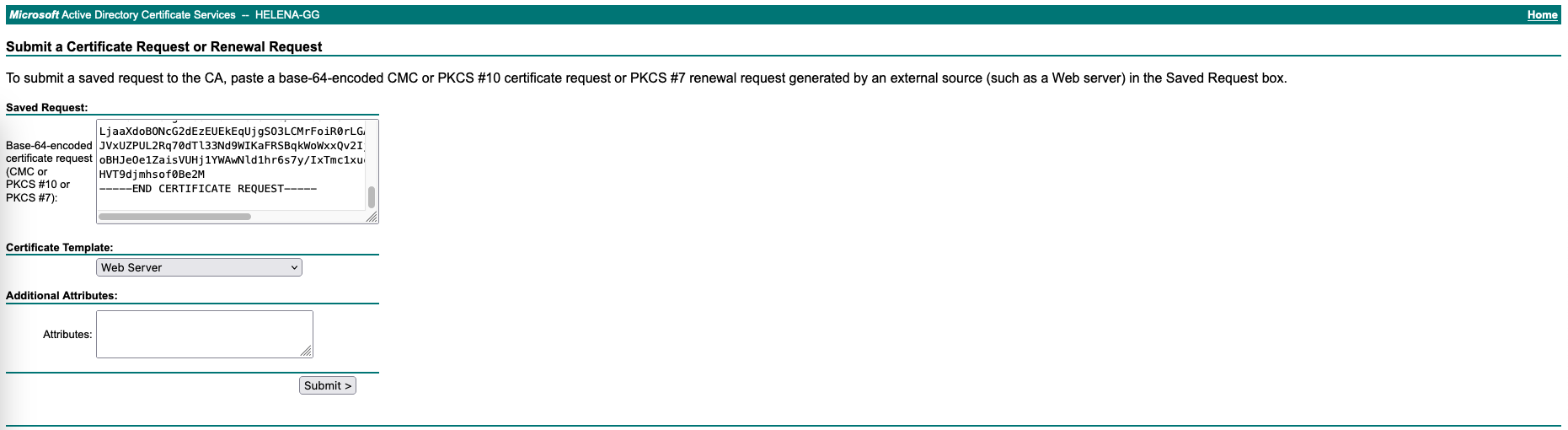 Then just sign the CSR on the Certificate Authority (CA) of the local domain, in this case is on a Windows Server of the Domain Controller.