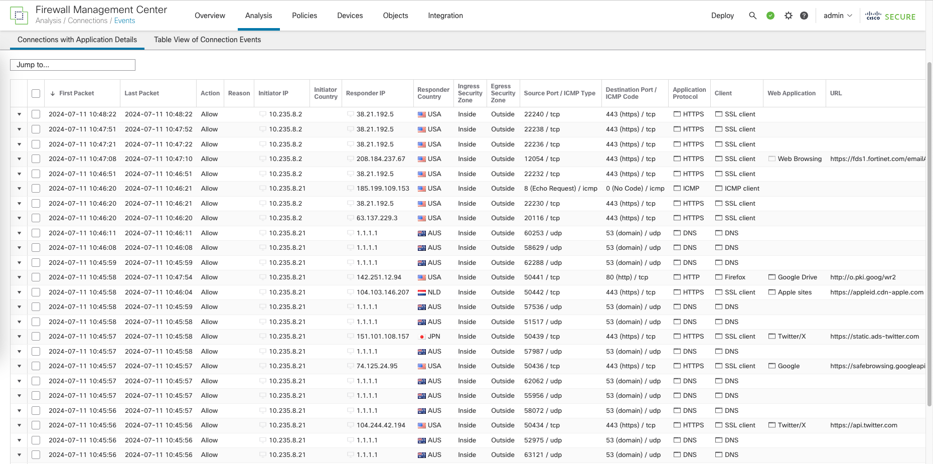 On FMC, go to Analysis » Events to see the traffic logs