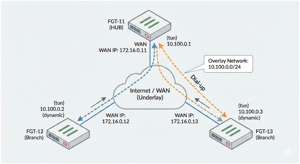 In this lab we will deploy Fortinet’s Hub-and-spokes VPN SD-WAN solution with VPN Manager and SD-WAN Manager inside the FortiManager following this topology