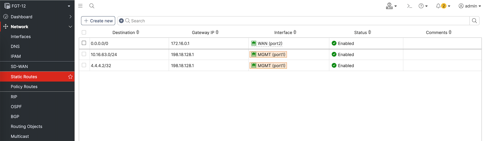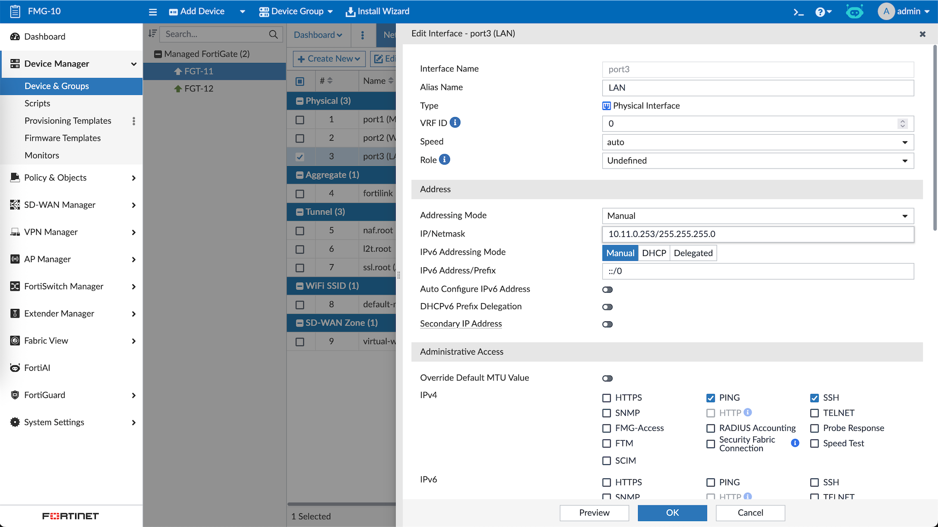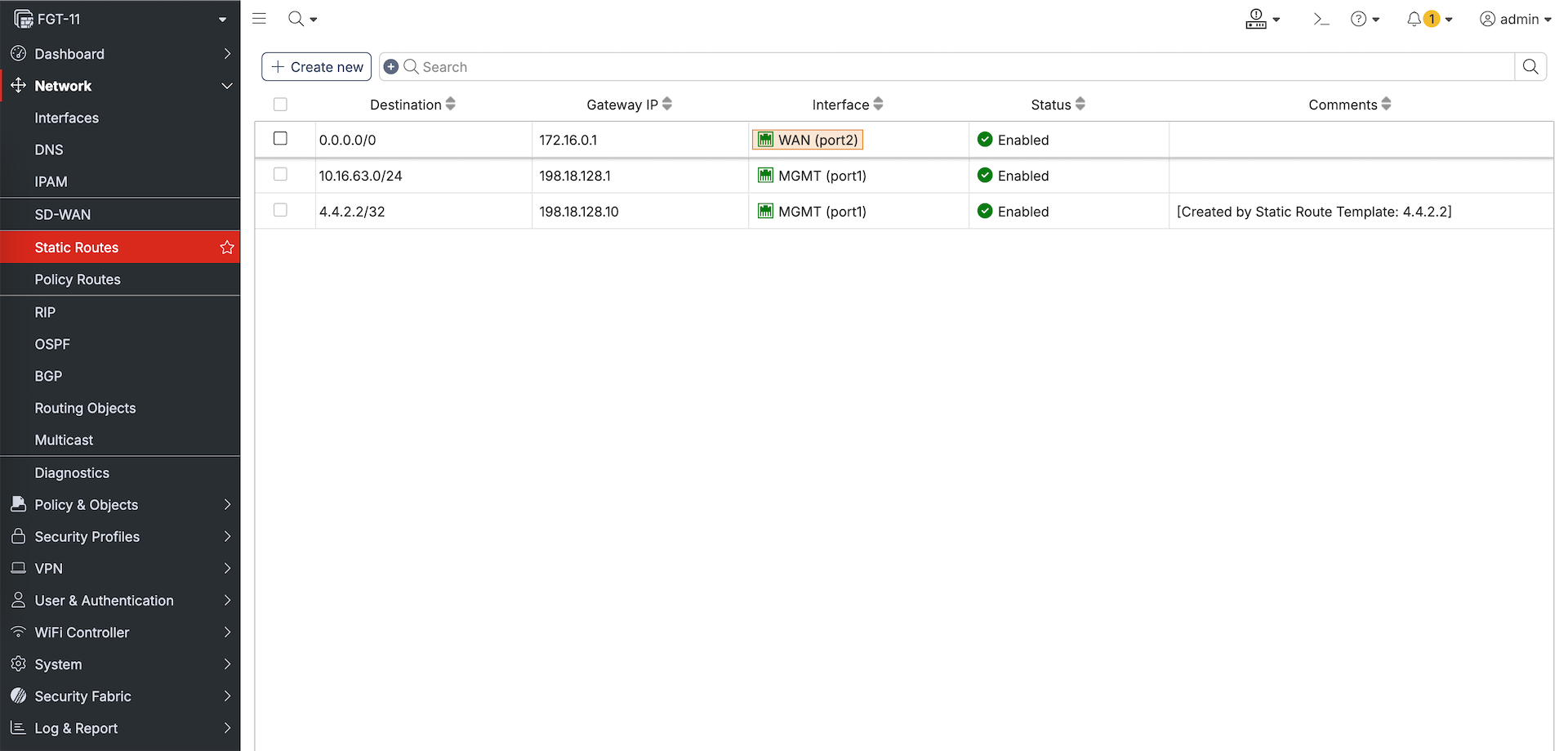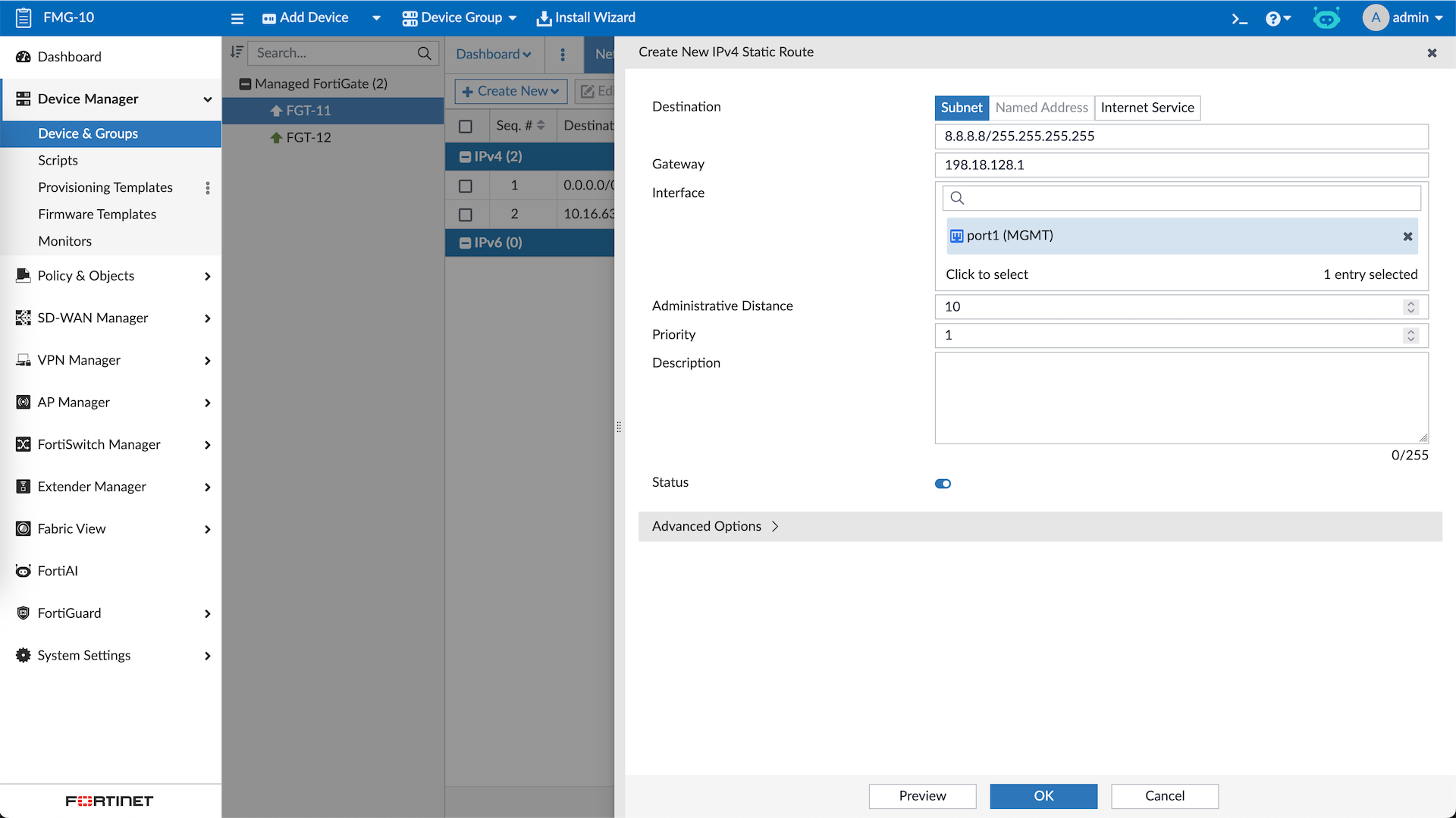 Managing these devices include making changes directly to them, here we will make some changes to FGT-11’s Interface and Static Route