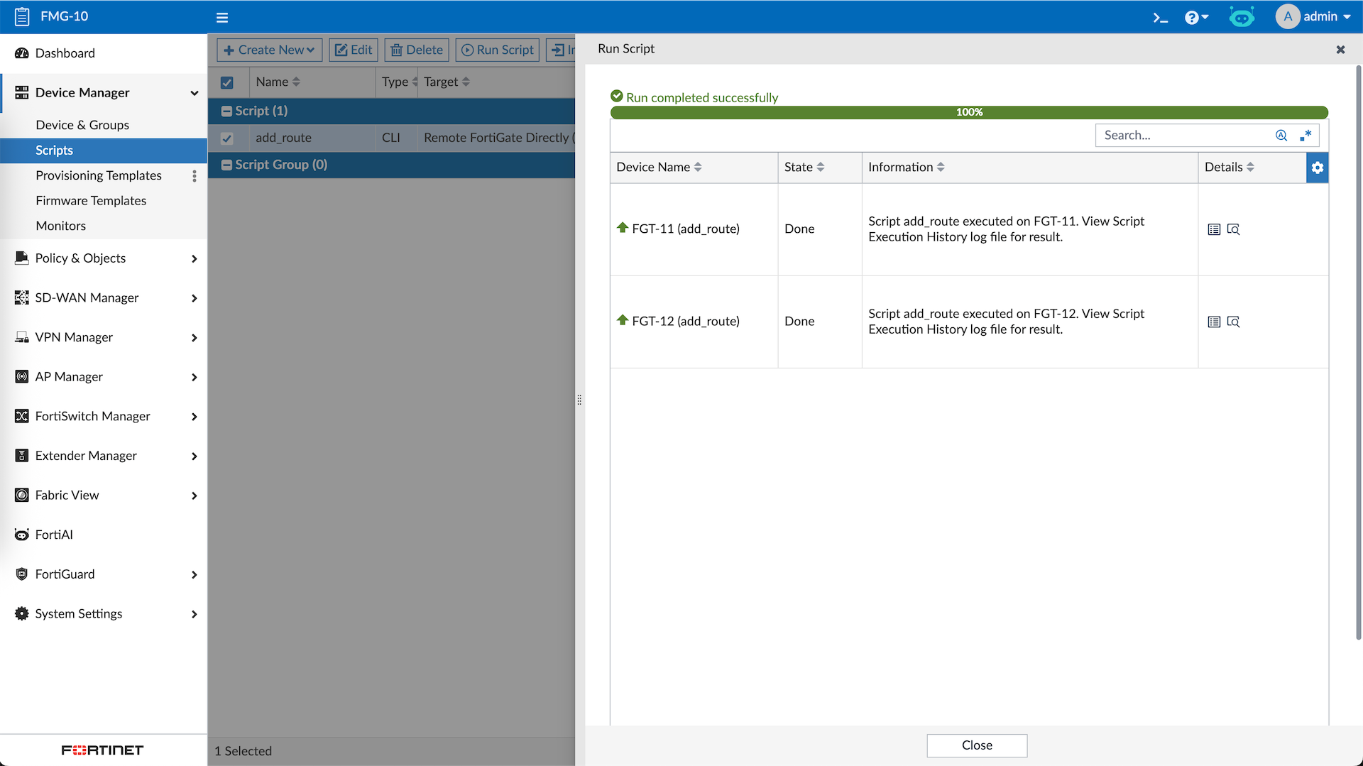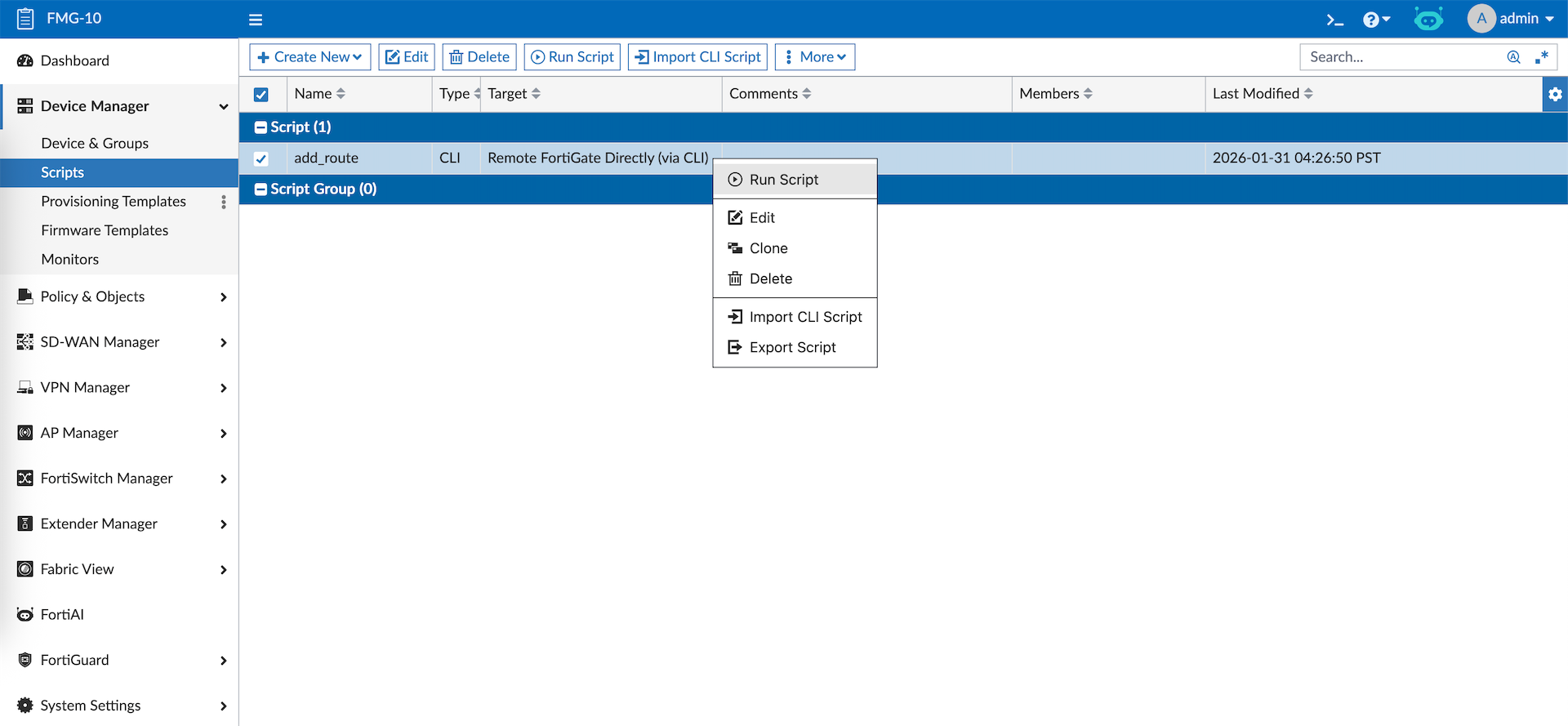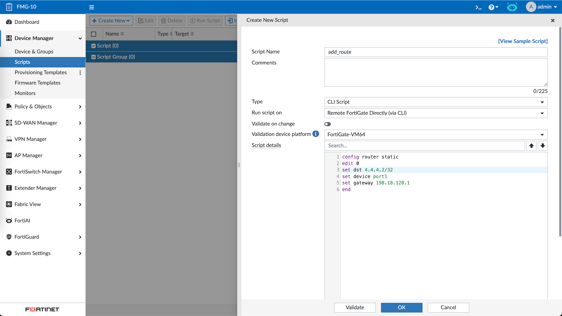 Scripts allow us to easily and quickly push some CLI configs to the devices, here we add a CLI Script to add static route