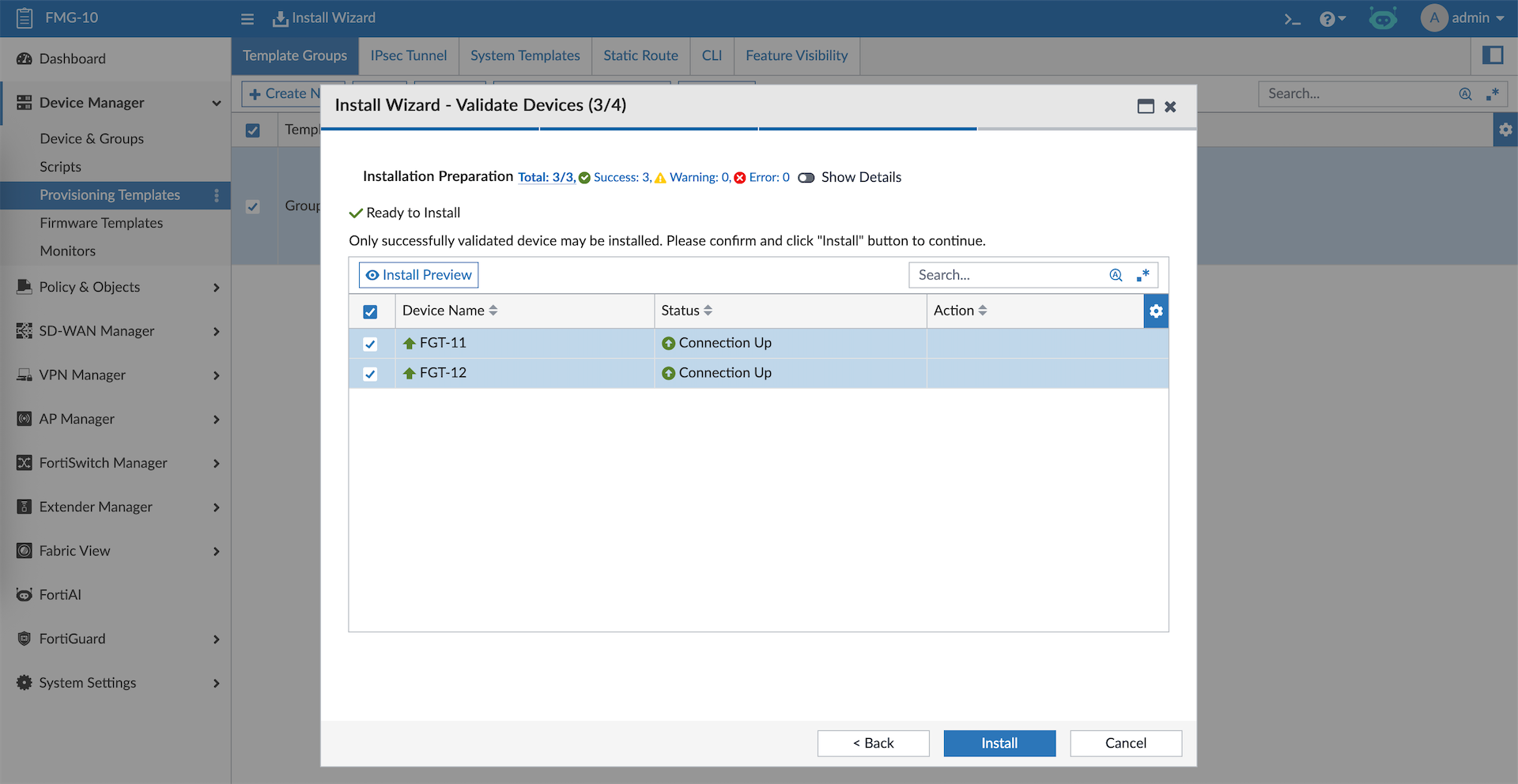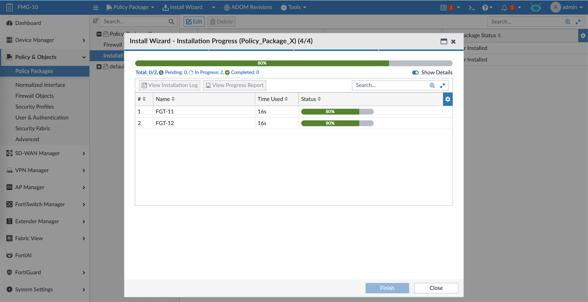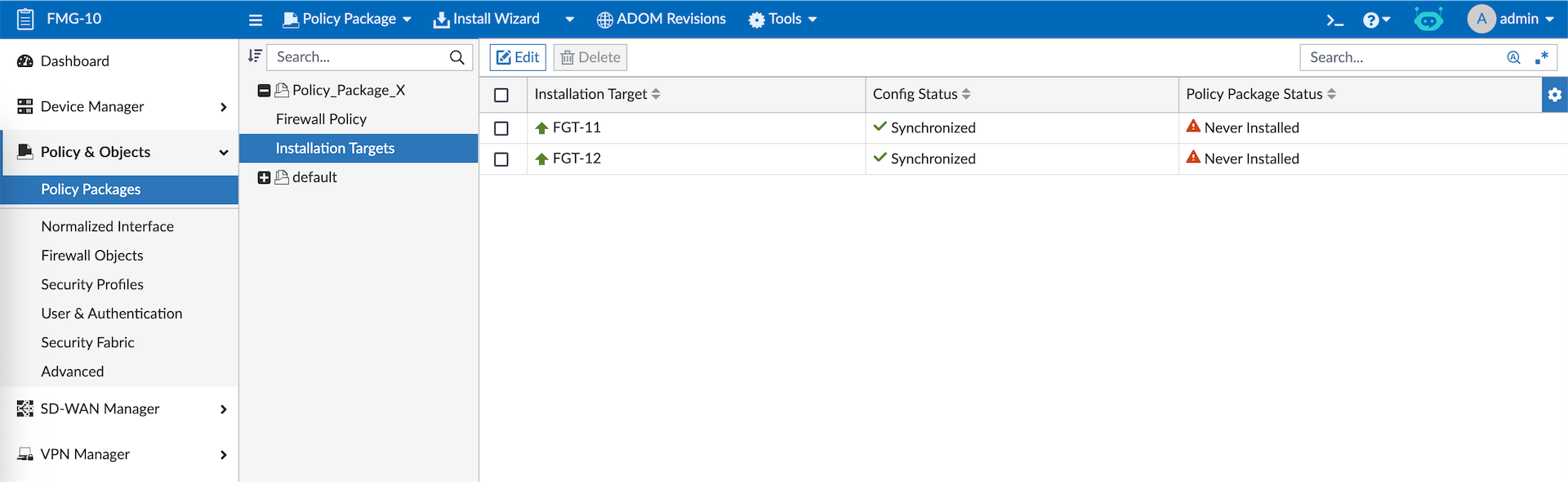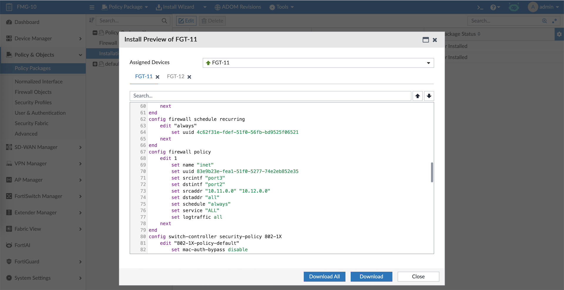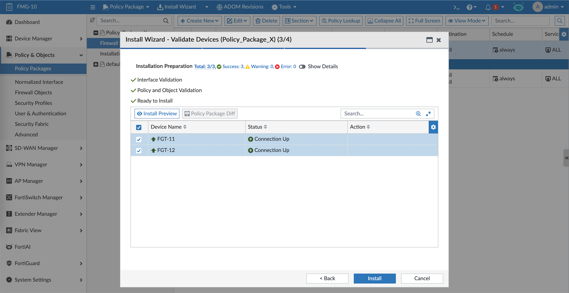 And the firewall policies along with the objects created on FMG are pushed to all target devices