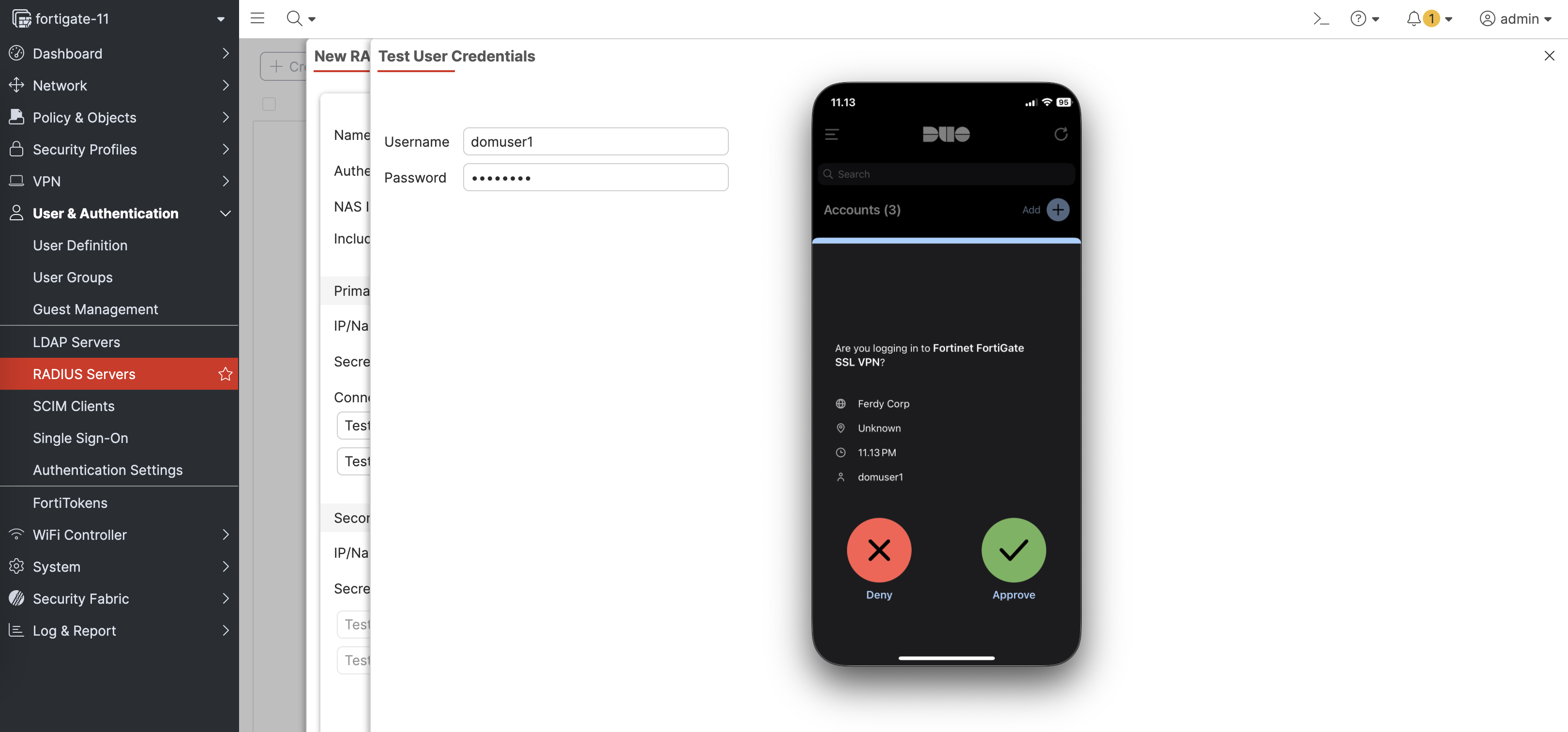 Next on the Fortigate, create a new Radius Server pointing to the Duo Proxy Server