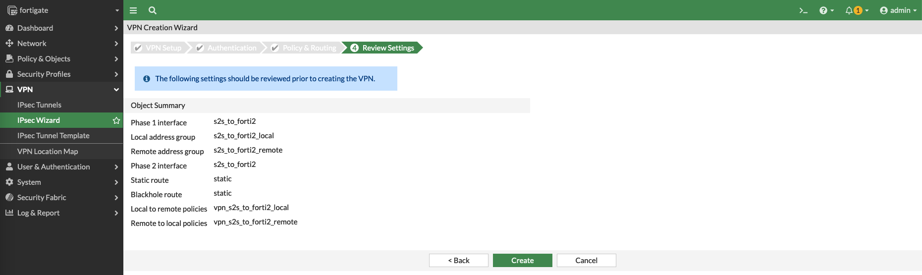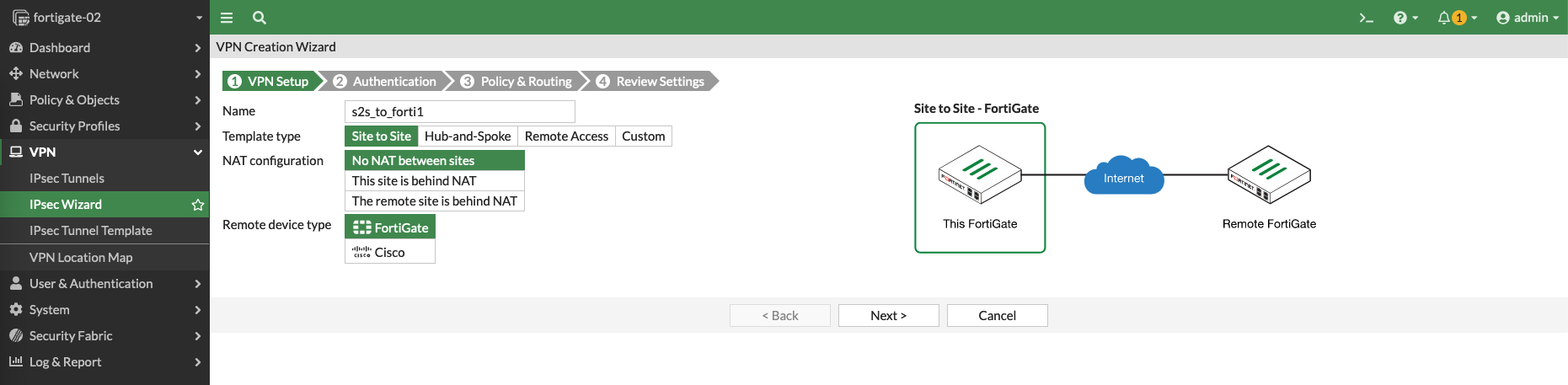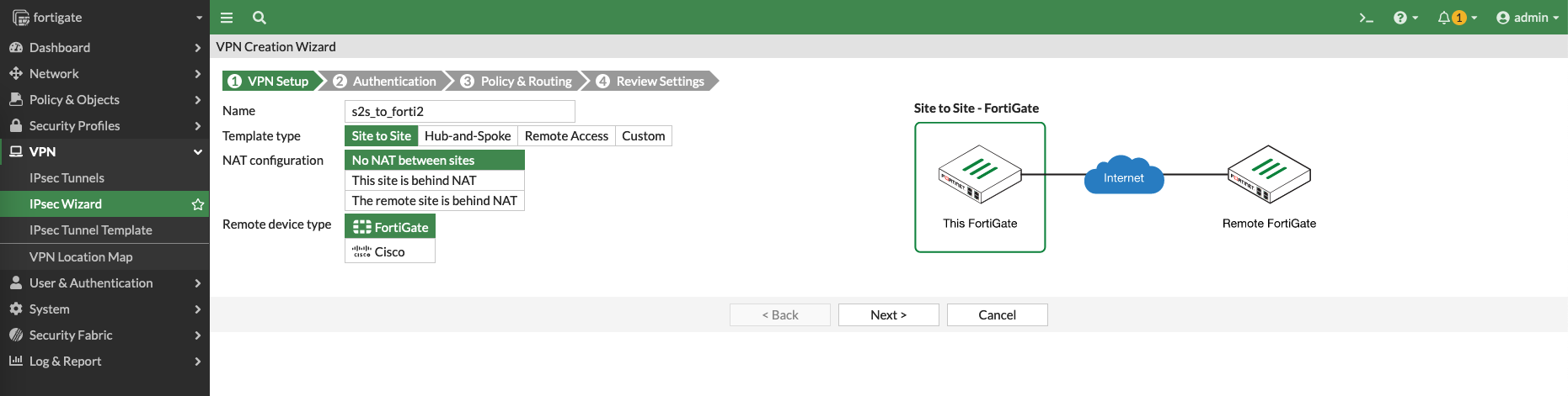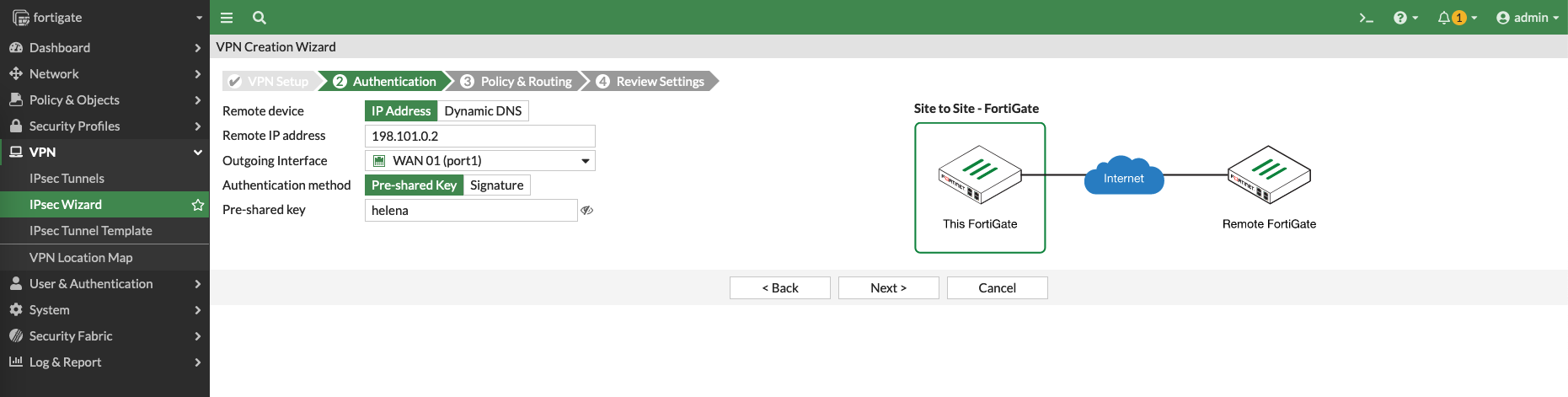 Then on Forti1 (node1), create a Site to Site VPN with IPSec Wizard