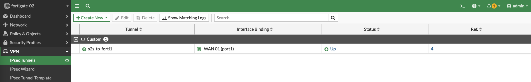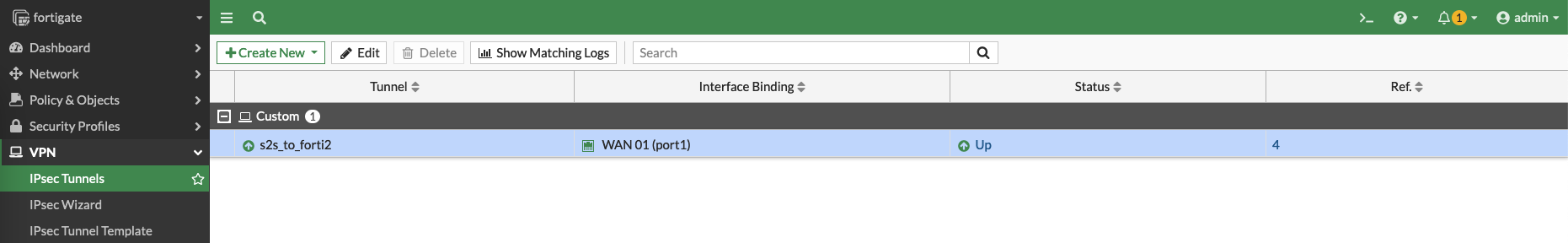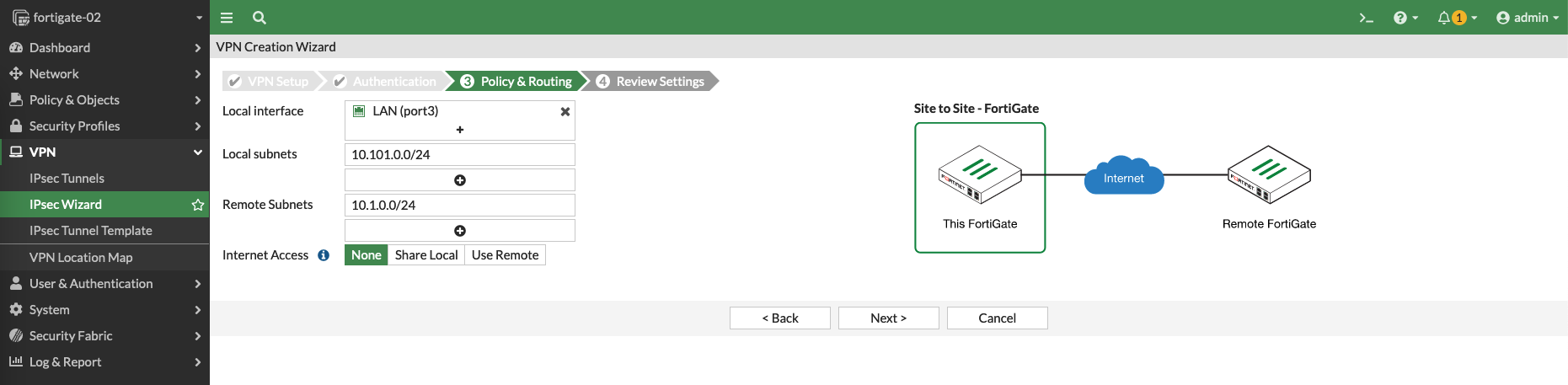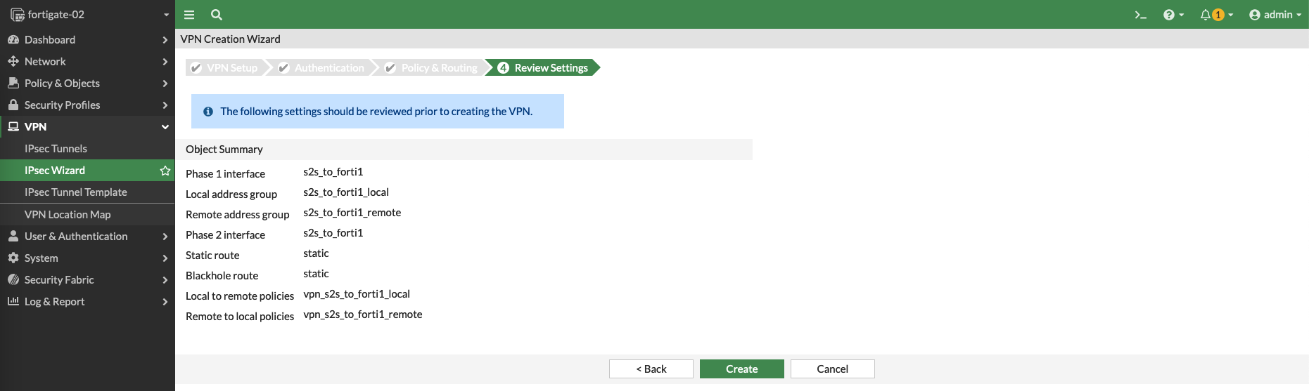 Then on Forti1 (node1), create a Site to Site VPN with IPSec Wizard