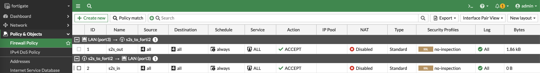 After that, create 2 firewall policies to allow network coming out and in over VPN
