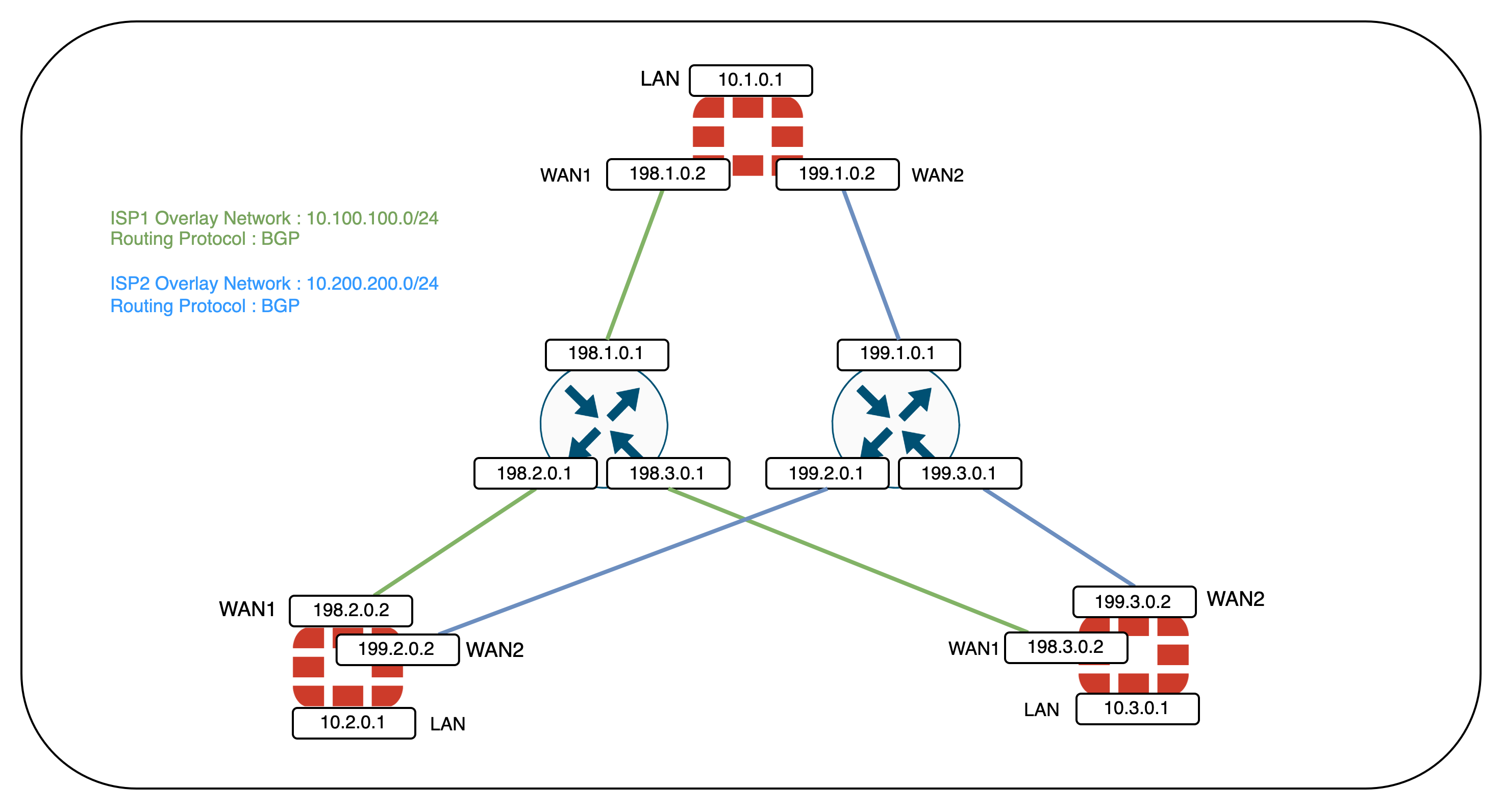 Here’s the network topology for this deployment, where we also have BGP as the overlay network to handle the routing of traffic between different SD-WAN edges
