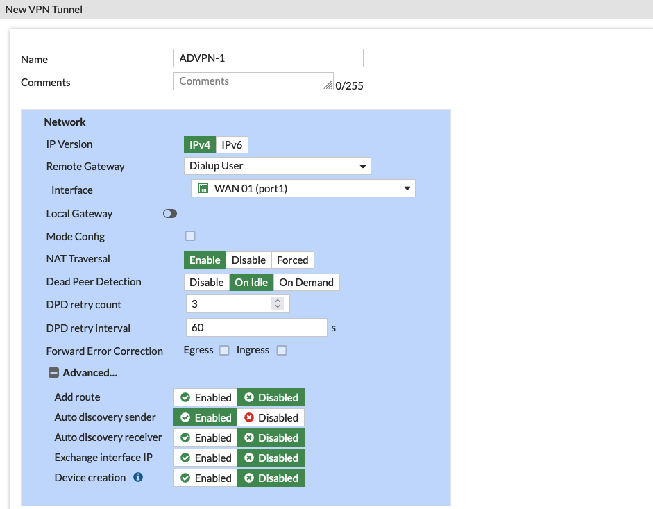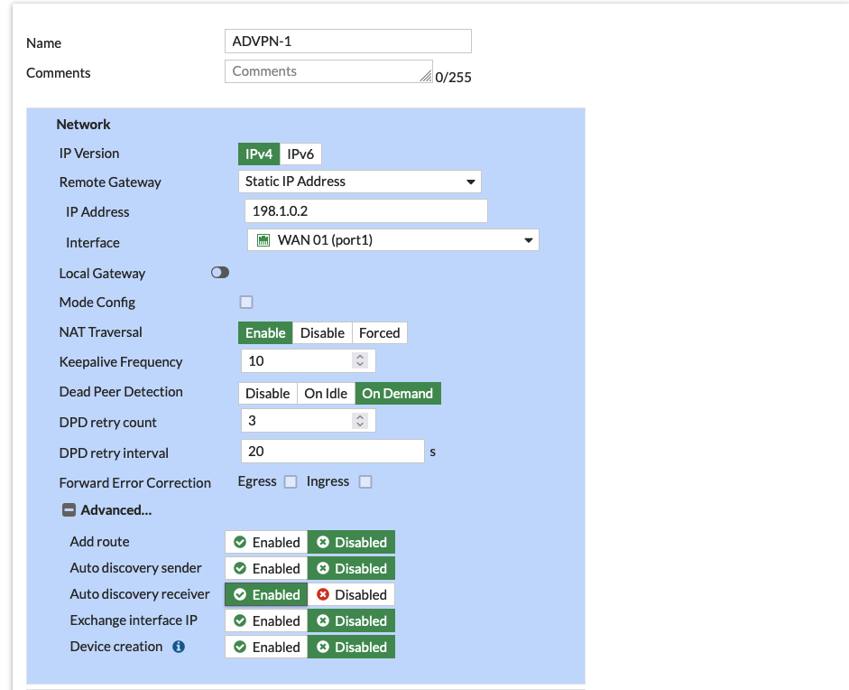 - Disable Add Route ensures IKE doesn’t add routes when dynamic tunnel is negotiated, because routing will be handled by BGP