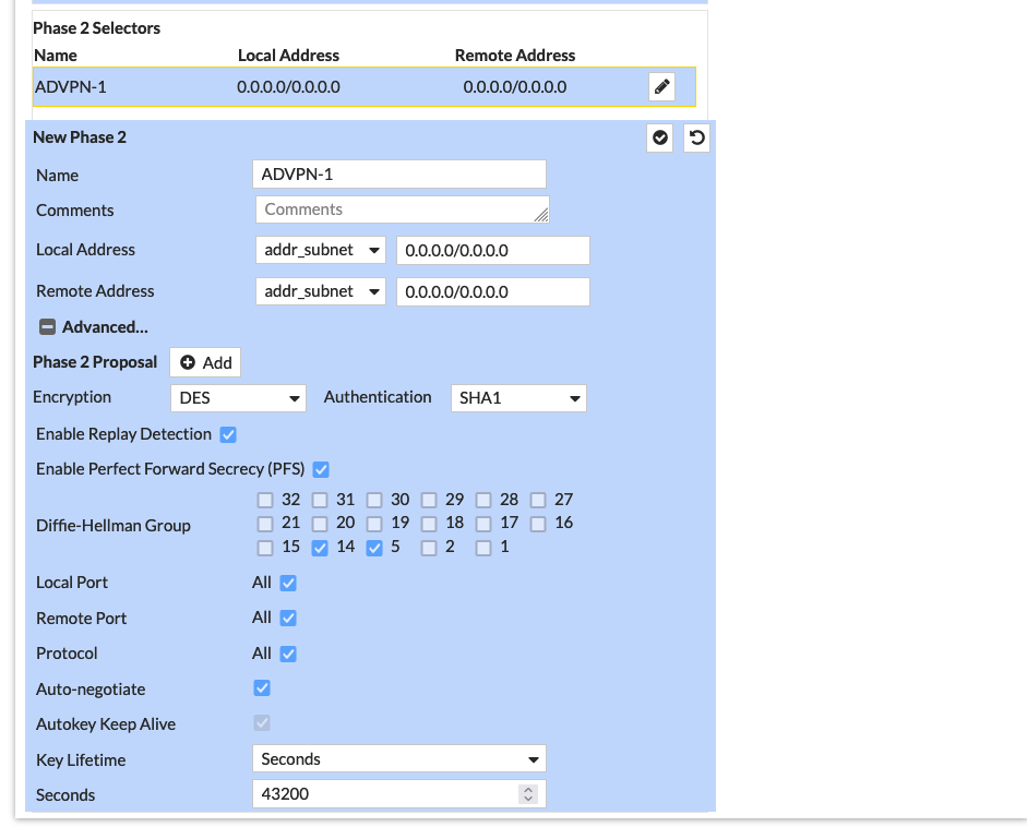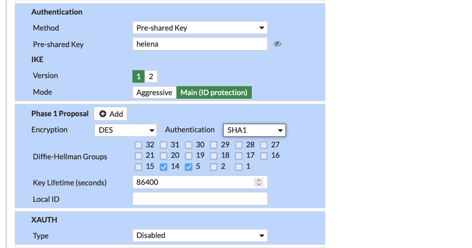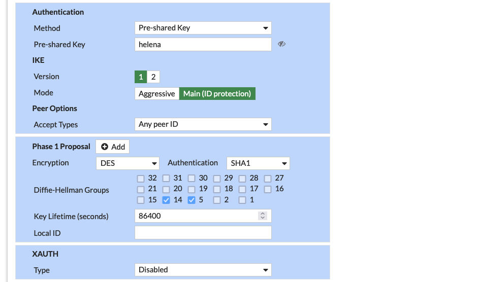 Configure the Pre-shared Key and Phase 1 Proposal as needed