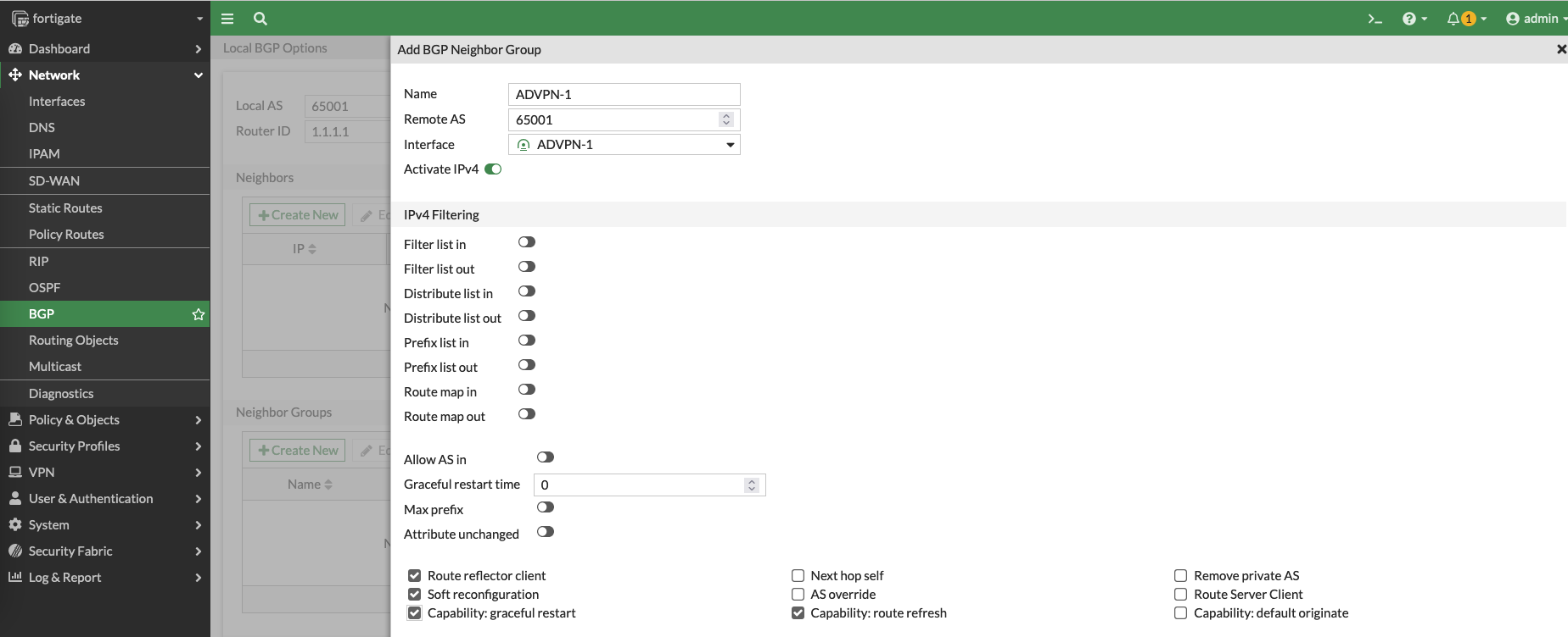 set the Local AS to be 65001 and add a neighbor group containing the VPN 1 interface, make sure to enable the Route reflector client